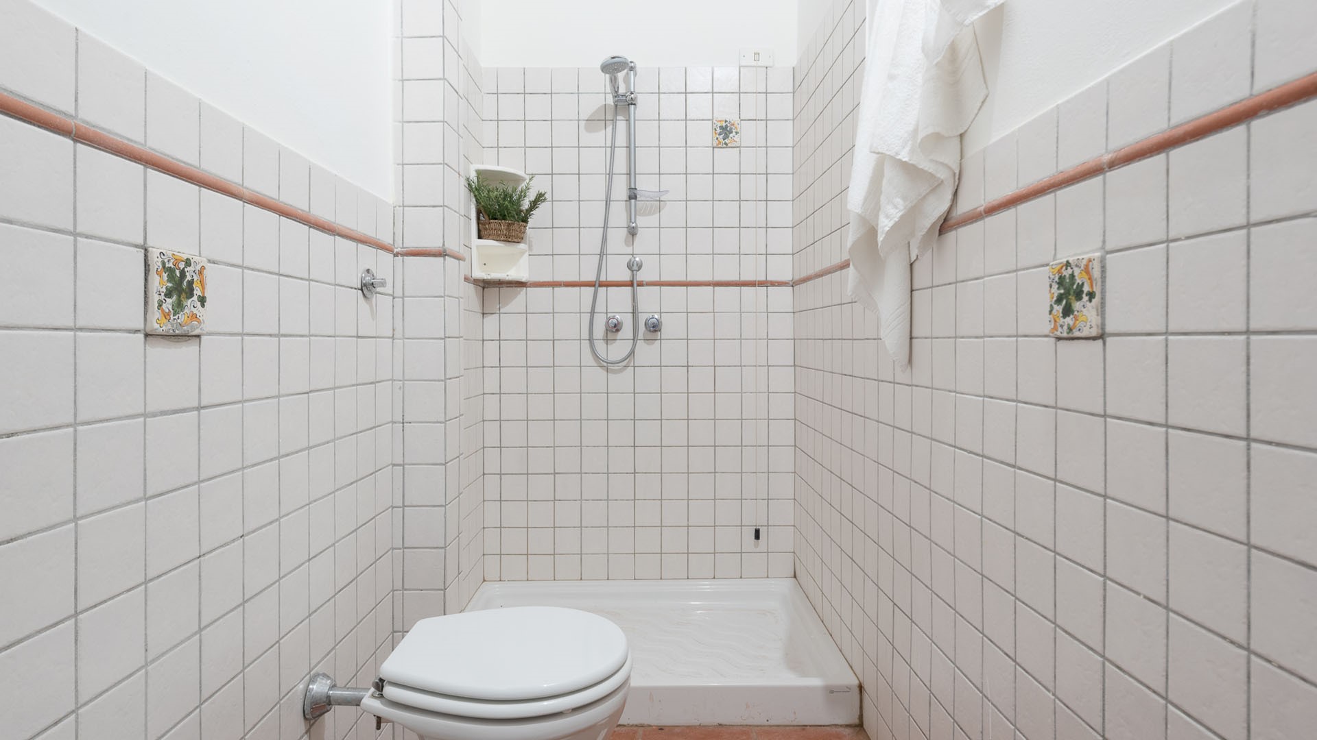 9 x 17 m with a varying depth of 1 to 3 m, with a circular hydromassage area with terracotta seating, is lined in sky-blue tiles with a terracotta border and has five Roman steps in terracotta and a ladder for access to the water. All around the pool is the large, tuff-paved sunbathing area, equipped with comfortable sunbeds for relaxing in the sun. There is a cold and hot-water shower and a wooden gazebo with table and armchairs. The pool has chlorine purification and internal and external lighting and so can be used at night as well. The pool is open from the last Saturday of April until the first Saturday of October.