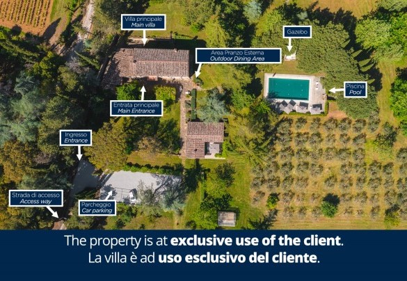 The wonderful estate in which Villa Metelliano is located extends for about 10, partially-fenced, hectares; surrounding the villa is an area of about 3 hectares with the well-kept park for exclusive use, a luxuriance of many types of blooms, cypresses, old oaks, palm trees, olive groves, walnuts, potted lemons and various fruit trees that alternate in the manicured green lawn areas around the houses and in the pool area. An outdoor dining area is located under a pergola with bamboo canopy and equipped, on three sides, with automatic closing curtains in transparent PVC. An additional relaxation area is located in front of the annex with chairs and table, shaded by a large umbrella. A row of cypresses flanks the driveway from the automatic iron gate to the 6-car parking area with a canopy of Virginia creeper.