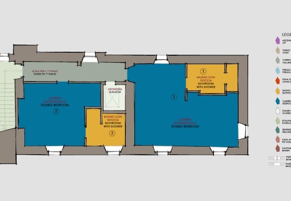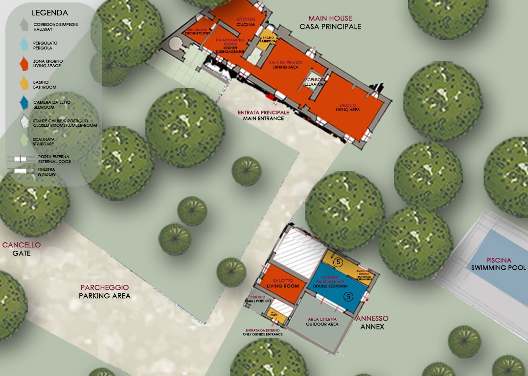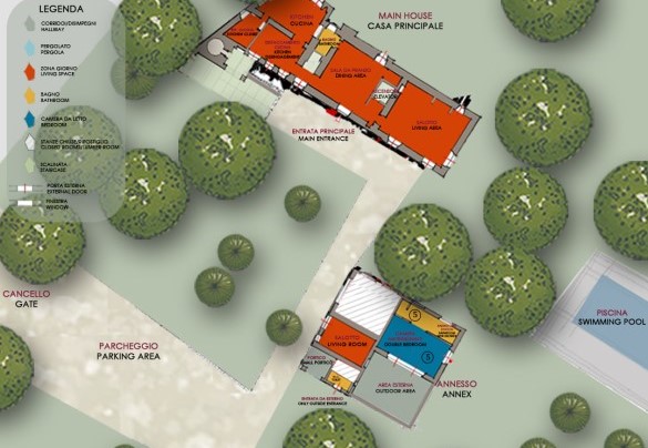 The property consists of the main house and an annex for a total area of about 300 sq m. MAIN HOUSE: Villa Metelliano has three floors connected internally by stairs and also by a lift. From the main entrance, located on the ground floor, you accede to a spacious hall with, on the left, the dining room which leads to the super-equipped industrial kitchen with access to the external laundry. On the right of the hall is the large living room with sofa, armchairs, Smart TV and fireplace (ornamental). Completing the floor is a guest bathroom. The living room, dining room and kitchen all have French windows giving direct access to the set-up garden structures. In the hallway between the kitchen and the dining room is the staircase leading to the first floor, which can also be reached with the lift. The first floor consists of two double bedrooms with ensuite bathroom with shower. Another flight of stairs, or the lift, leads to the second floor consisting of two double bedrooms with ensuite bathroom with shower. ANNEX: A single floor, it is located a few metres away from, and on the same level as, the villa. A large French window leads directly into a double bedroom with ensuite bathroom with shower. In front of the entrance to the bedroom is a romantic, private outdoor area equipped with umbrella, armchairs and table. Completing the annex, with entrance only from the outside, is a guest bathroom. All the bedrooms are equipped with air conditioning, safe, minibar and satellite TV. Finally, the laundry room, which includes a bathroom with shower, is located just outside the kitchen, down a flight of 6 steps.