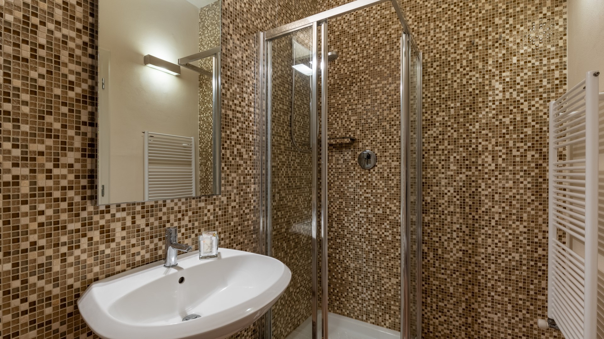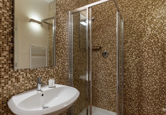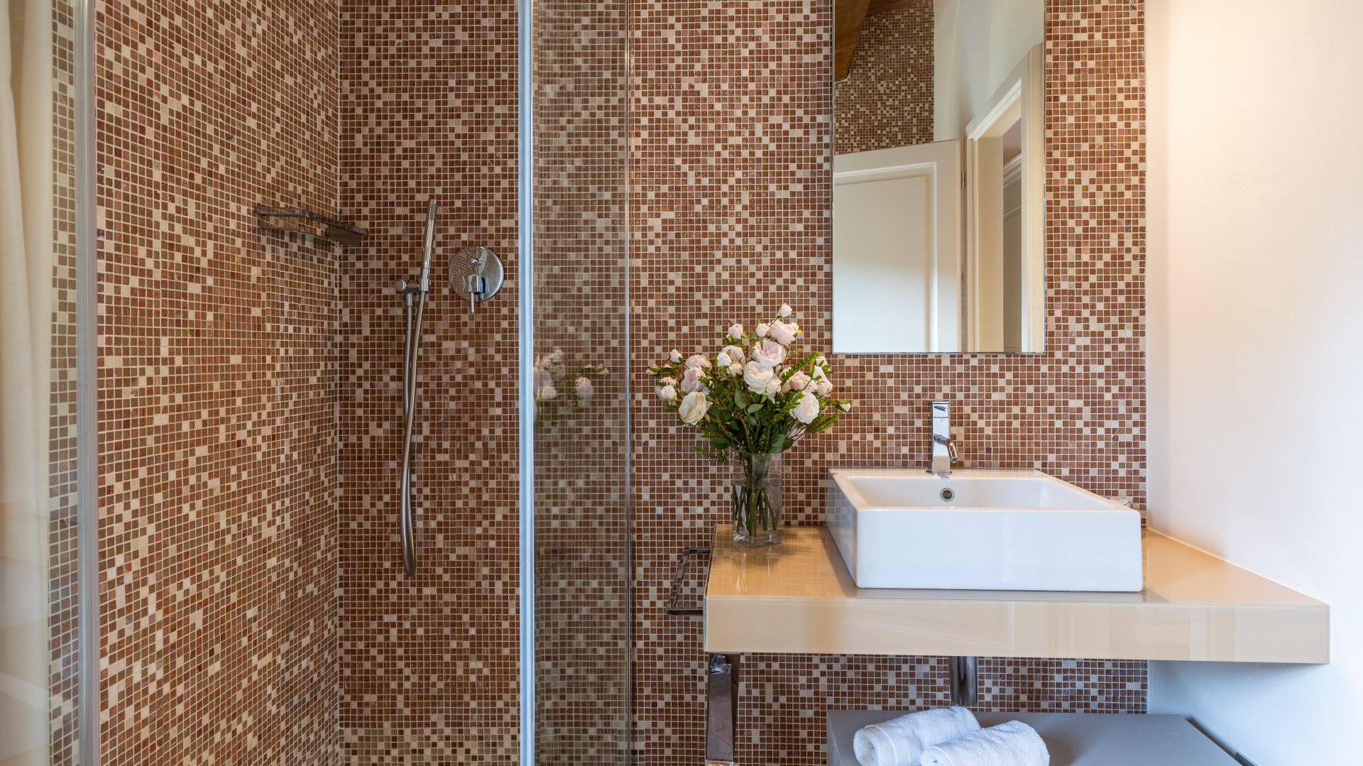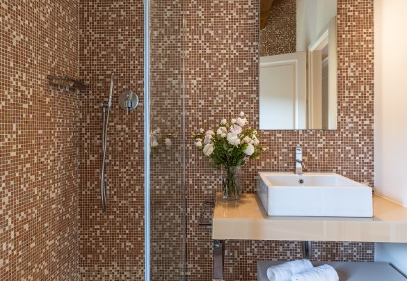 The completely enclosed, rectangular-shaped, infinity pool occupies the furthest terrace of the property through a specific design choice, setting it in a private position, with sun all day long and looking out over the enchanting country and wooded panorama against the backdrop of Volterra. About 80 m from the house, it is reached via a driveway paved with faux antique stone and then a flight of steps preceded by a gate for child safety. The pool is lined with a blend of assorted iridescent green-brown mosaics which, with the border of nut-coloured travertine, confers a delicate and more natural shade of green to the water, creating a perfect harmony of colour with the surrounding vegetation. The pool measures 7 x 14 m with a constant depth of 1.5 m and has a ladder for access to the water. The pool runs on a new cleaning system which uses small doses of clhorine and has both internal and external lighting. The solarium area is paved in stone and is bordered by fragrant, colourful cushions of lavender and rosemary and is furnished with elegant sunbeds. There is a hot and cold water shower and a minibar. The pool is open from the last Saturday in April until the first Saturday in October.