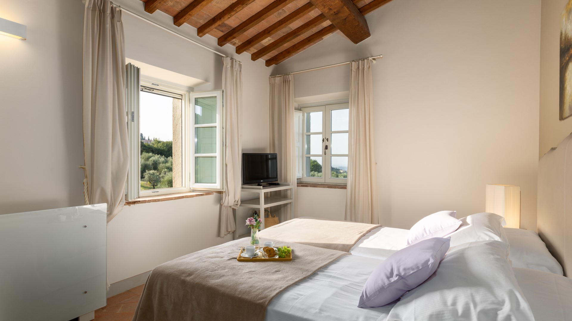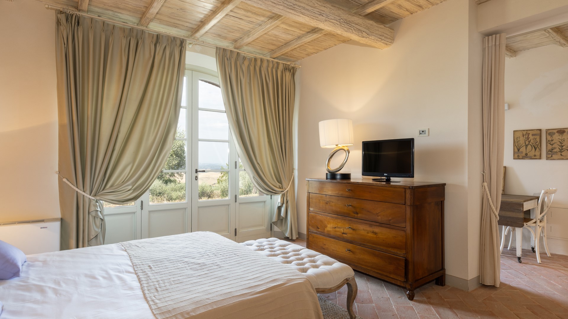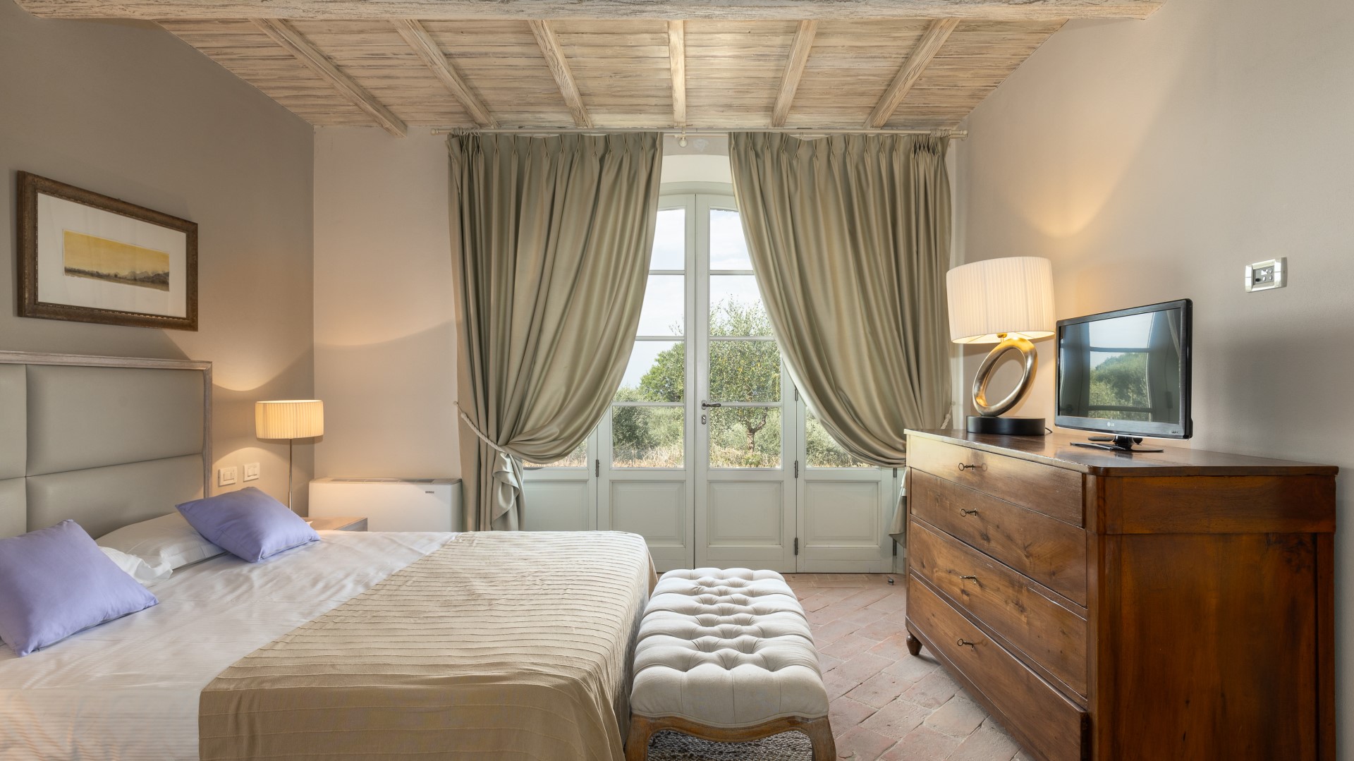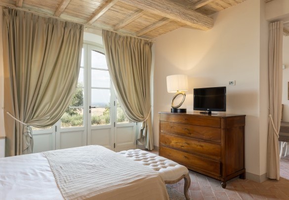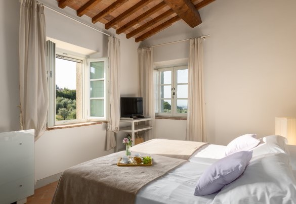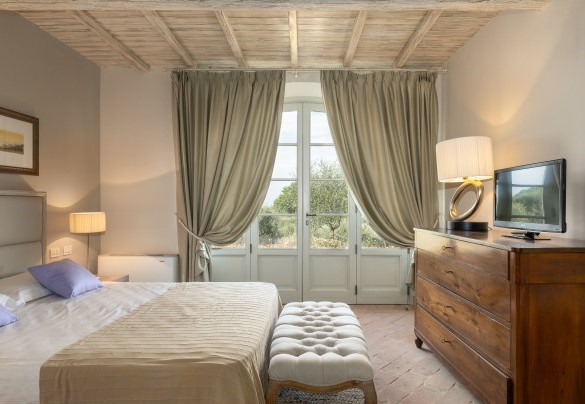 Villa Panorama is also perfectly located to enjoy Andrea Bocelli's summer concert at the nearby "TEATRO DEL SILENZIO" (www.teatrodelsilenzio.it/news.php) honorary President: the tenor Andrea Bocelli. Its pleasant hillside location allows it to dominate the beautiful panorama over the expanses of olive trees that cover much of the property and which produce an excellent extra virgin olive oil. The farmhouse has been completely revisited following a accurate design that has perfectly combined tradition and modernity and which responds to specific choices of functionality and of sophistication at the same time. The renovation has been implemented, in fact, in accordance with the principles of green building and eco-sustainability, characteristics which contribute to significant energy saving and improve the liveableness of the environment in full ecological respect. The architectural choices of the restoration, however, have followed the classic spirit of the best Tuscan tradition, in fact, externally, the open-face walls are in stone while, inside, the spacious rooms of the living area, all facing on to the garden, are connected by arches with vaulted ceilings (terracotta tiles and iron girders) and have fine natural terracotta floors. All the rooms have been lightened with luxurious furniture, whose design is inspired by refined modernity, and the furnishings are simple and elegant with touches of country chic inspiration, in perfect harmony with the pastel shades of the walls, and with fine decorative details that enrich every corner of the house, creating a warm and hospitable atmosphere. Another highlight of this beautiful house, in which the standards of quality and comfort attain a rare excellence, is the fully equipped wellness area with whirlpool tub in the centre from where, thanks to the large windows surrounding it, guests can admire the beautiful panorama all around. From La Villa, hidden from view yet only a few metres away from the centre of Chianni, guests can easily get to the many destinations of great artistic and cultural interest, like the Tuscan towns of Pisa, Lucca, Florence, San Gimignano, Volterra and Siena, and also to some of the famous spas in the vicinity, like Casciana, Uliveto and Montecatini, as well as the beautiful beaches of the Livorno shore and of Versilia.