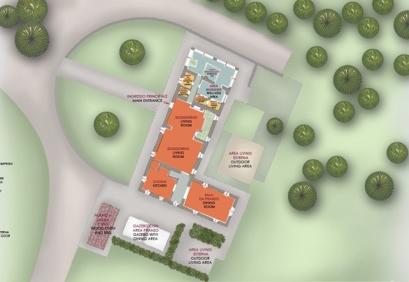 The property covers about 30 hectares divided between the olive grove and a thick wooded area composed of oaks and holm oaks and dotted with footpaths. The park around the house, about 3 hectares, is fully fenced-in and equipped with alarm; here areas of lawn bordered by colourful aromatic bushes, fruit trees and olive trees alternate with paved areas. Near the kitchen is a small vegetable garden with a wide range of herbs to enhance the typical Tuscan dishes together, perhaps, with the good oil produced by the farm and next to it is the patio with the sitting areas. The outdoor dining area, in front of the kitchen, is protected by a brickwork gazebo complete with pizza oven and brick barbecue, the ideal place for cookouts in the company of friends, immersed in a peaceful and friendly bucolic atmosphere. Finally, to ensure space for meditation and outdoor relaxation, two sitting areas, furnished with sofas and armchairs, have been set up in front of the French windows of the living area.