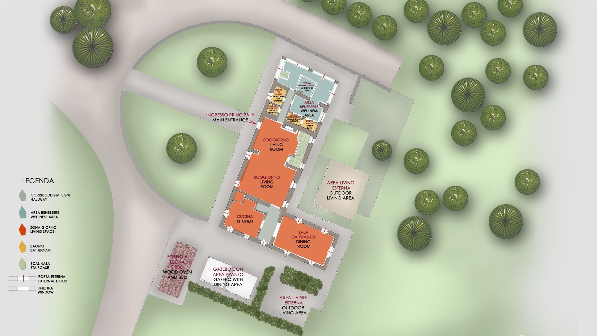 The three-storey house is set on two levels on sloping ground, with direct entrance from both the ground floor and the basement. The main entrance on the ground floor opens into the living area composed of a large lounge with satellite TV and fireplace, a dining room and a modern, fully equipped kitchen with central island. The rooms have French windows that allow access to the furnished outside areas. The lounge leads to the wellness area equipped with whirlpool tub, Turkish bath and chromo-therapy shower, completely surrounded by large windows facing the garden. The floor is completed by two toilets one of wich for disabled people. The sleeping area on the first floor is composed of two twin bedrooms (with joinable beds) with ensuite bathroom with shower and four double bedrooms (one with king size bed) with ensuite bathroom, three with shower and one with shower and tub. And finally, on the same floor, is a cosy reading room. A spiral staircase, situated to one side of the wellness area, leads down to the basement, also with separate entrance, composed of a double bedroom, a bathroom with shower, a functional kitchenette and the laundry.