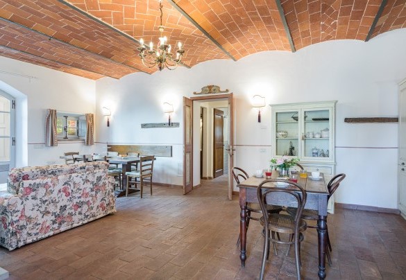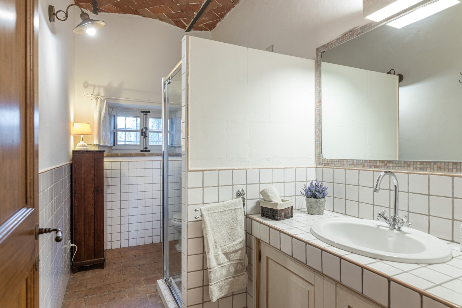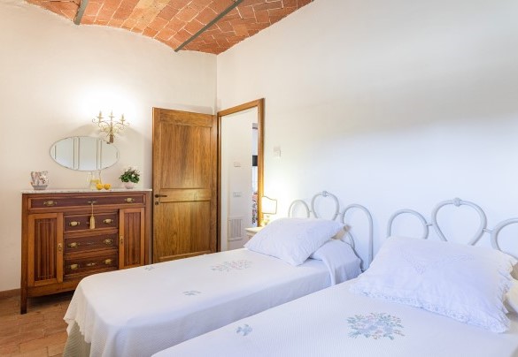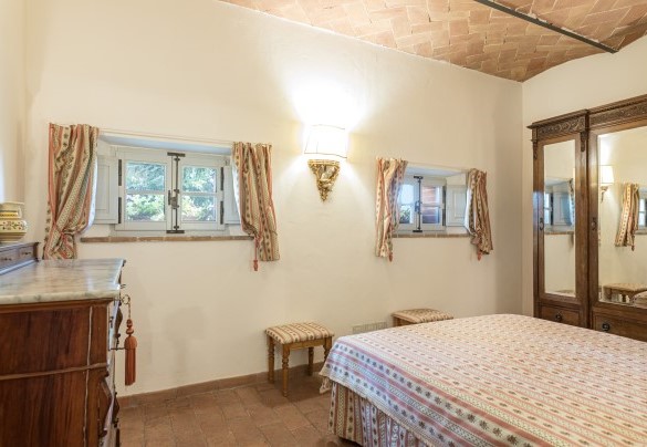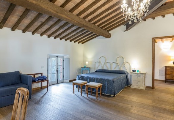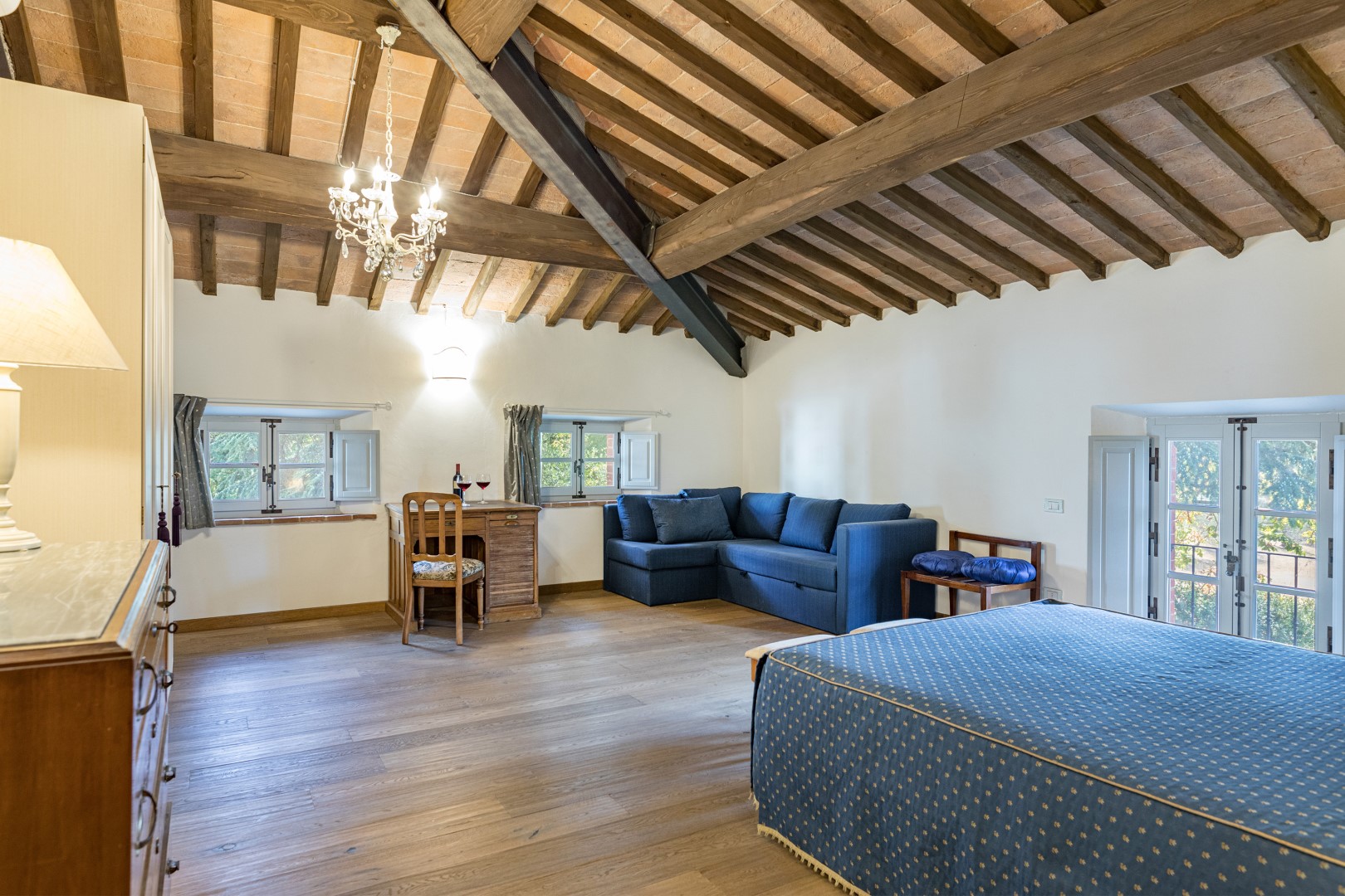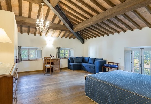 The structure consists of a three-floor 16th century villa, and an annex in stone and brick divided into two floors (about 20 m from the villa) with a 100 sq m apartment on each floor with independent entrance. VILLA: Three floors connected internally by an elegant stone staircase. The main entrance is located on the ground floor, in front of a green area with a large table and chairs. To the right of the main entrance is a living room furnished with Smart TV, sofa, armchairs and a table seating 6 with direct access to the outside. To the left of the entrance is a sitting room with frescoed ceilings, antique stone fireplace, sofa, armchairs, piano (tuned) and a dining table seating 8, with direct access to the outside. From the main entrance, a short corridor leads, on the left, to a guest bathroom and to a small games room with table football, and, on the right, to the dining room with an extendable table seating up to 14 people, with direct exit out to the gazebo with tables and to the pool area. The dining room is connected by a small arch to the fully-equipped kitchen with marble peninsula with stools and a wooden table with bench and chairs for 8 people, TV and direct outside exit. From the kitchen, through a door and up 4 steps and then down 4 steps, you come to the laundry area with a wood oven, a guest bathroom with shower and the stairs leading to the caretaker's house. Returning to the main entrance and going up 21 steps to the first floor, you come to a small landing which leads, through two respective doors, to the two wings of the first floor. In the right wing is a study, a double bedroom with ensuite bathroom with shower and tub, three double bedrooms and a bathroom with shower and tub, while in the left wing is a double bedroom with ensuite bathroom with shower and a study with Smart TV. Going up 21 steps to the second floor you come to a small landing which leads to the two wings of the second floor. In the left wing are two double bedrooms and an adjacent bathroom with shower, while in the right wing are two double bedrooms with walk-in closets, a bathroom with shower and a small TV room (Smart TV) embellished with old books. Also on the second floor is a furnished panoramic terrace which is accessed from the corridor through a French window. ANNEX: Two apartments with independent entrances. GROUND FLOOR: On the right is a laundry room, opposite which another door leads directly into the open-plan living room with kitchenette, a table seating 4, a table seating 8, two sofas, a TV and a fireplace . A door leads to the sleeping area with a double bedroom, a bathroom with shower and a twin bedroom (with joinable beds). FIRST FLOOR: accessed by an external, 19-step staircase, you enter directly into an open-plan living room with kitchenette, a table seating 4, a table seating 6, a chaise-longue, a corner sofa and a TV. From the living room a small hallway leads to a double bedroom and ensuite bathroom with tub.