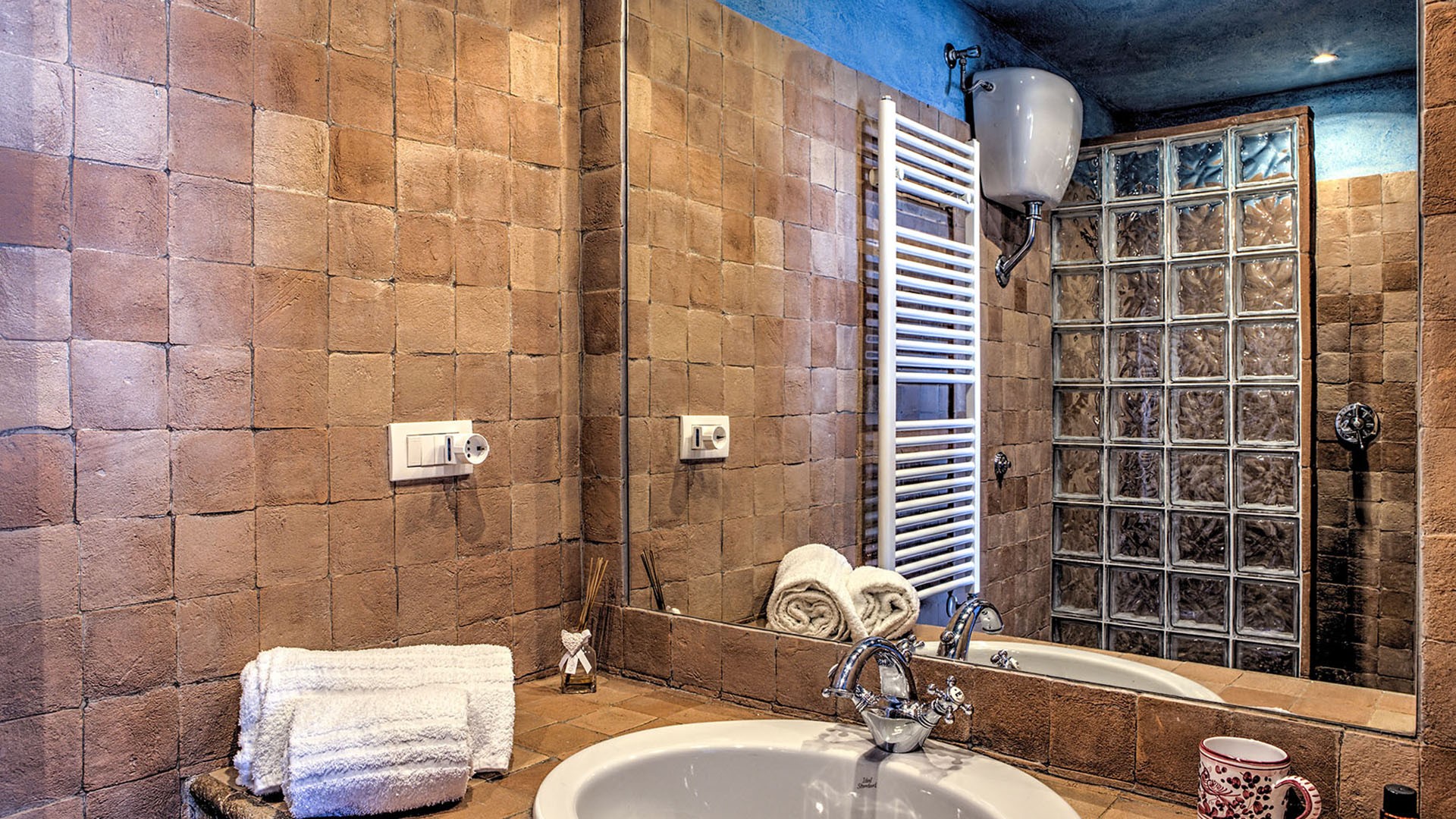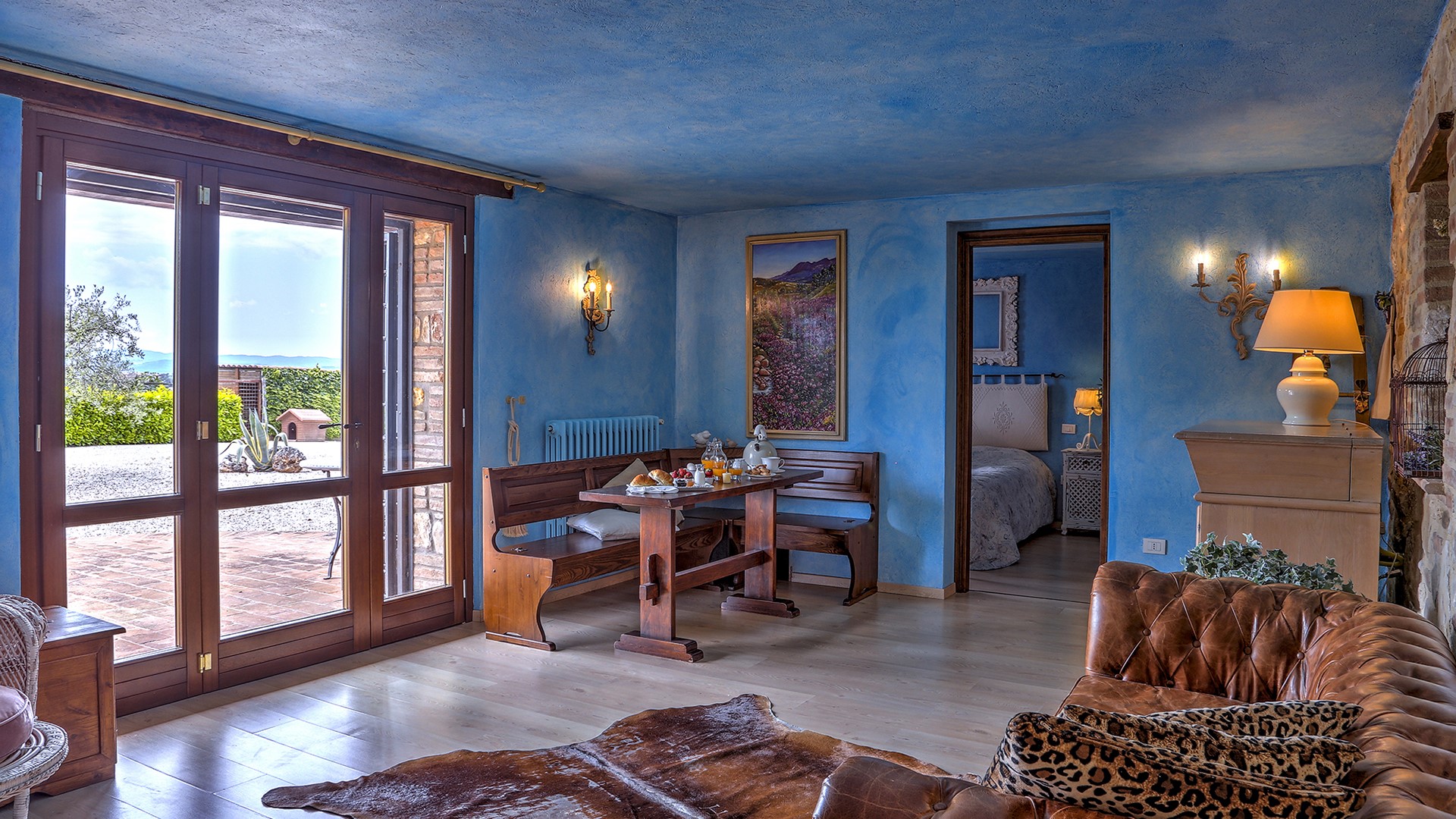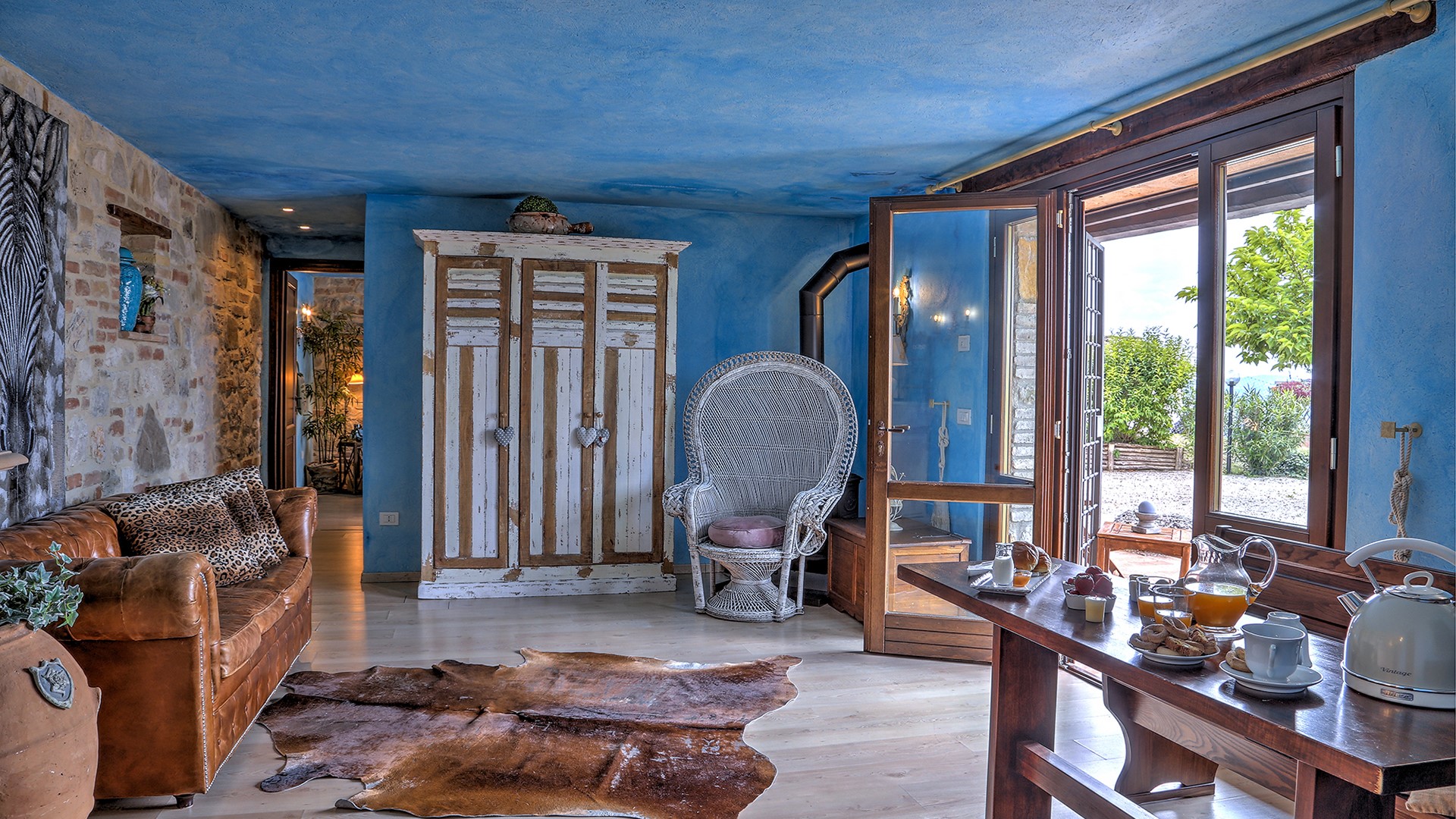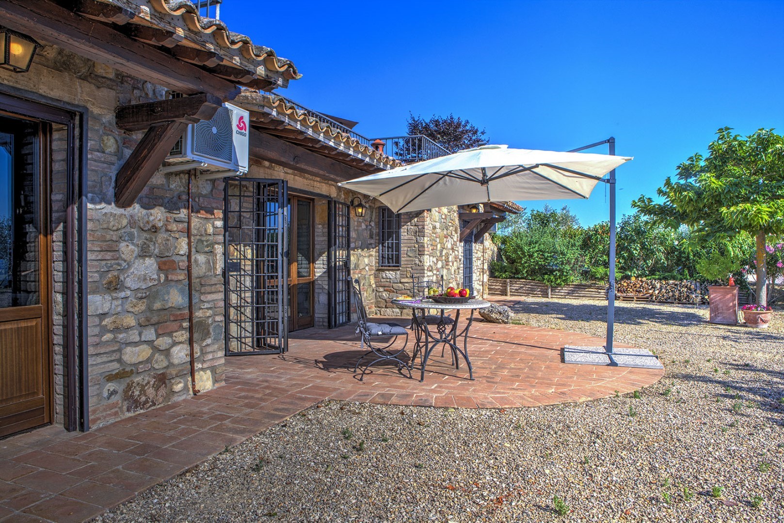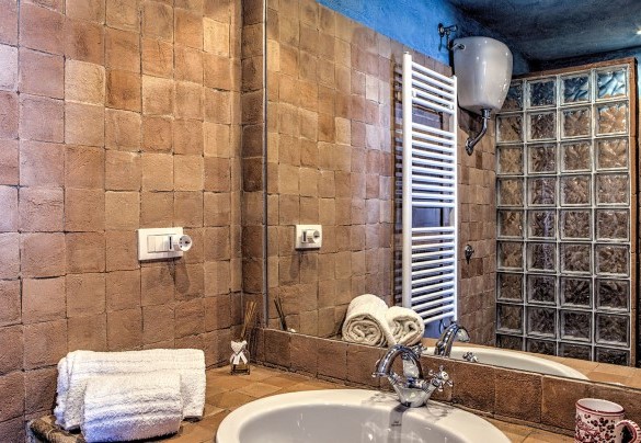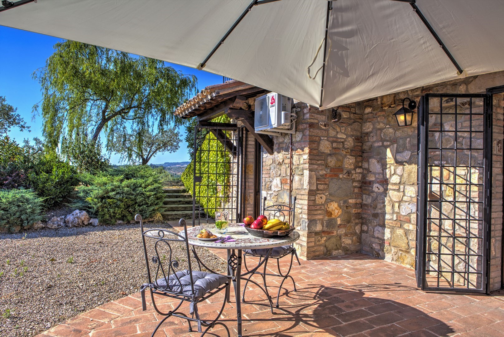 The swimming pool is set in a panoramic position overlooking the hills of Todi, on the same level as the main house, in front of the portico, and is reached from the living room across 15 mt of lawn. The rectangular pool, with its terracotta border and Roman steps, measures 12 x 6 mt with the depth varying from 1.20 to 2.70 m. It is lined in PVC and has chlorine and oxygen purification. The terracotta-paved sunbathing area is equipped with sunbeds and umbrellas. Completing the comfort and ensuring shade during the hottest hours is a gazebo with sofa and coffee table. The swimming pool is open from the last Saturday of April until the first Saturday of October