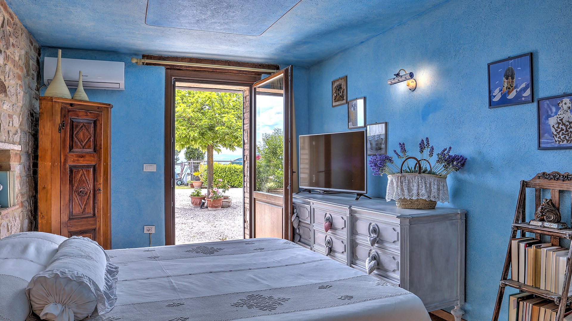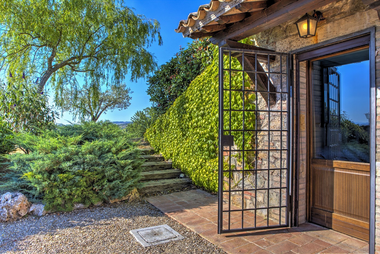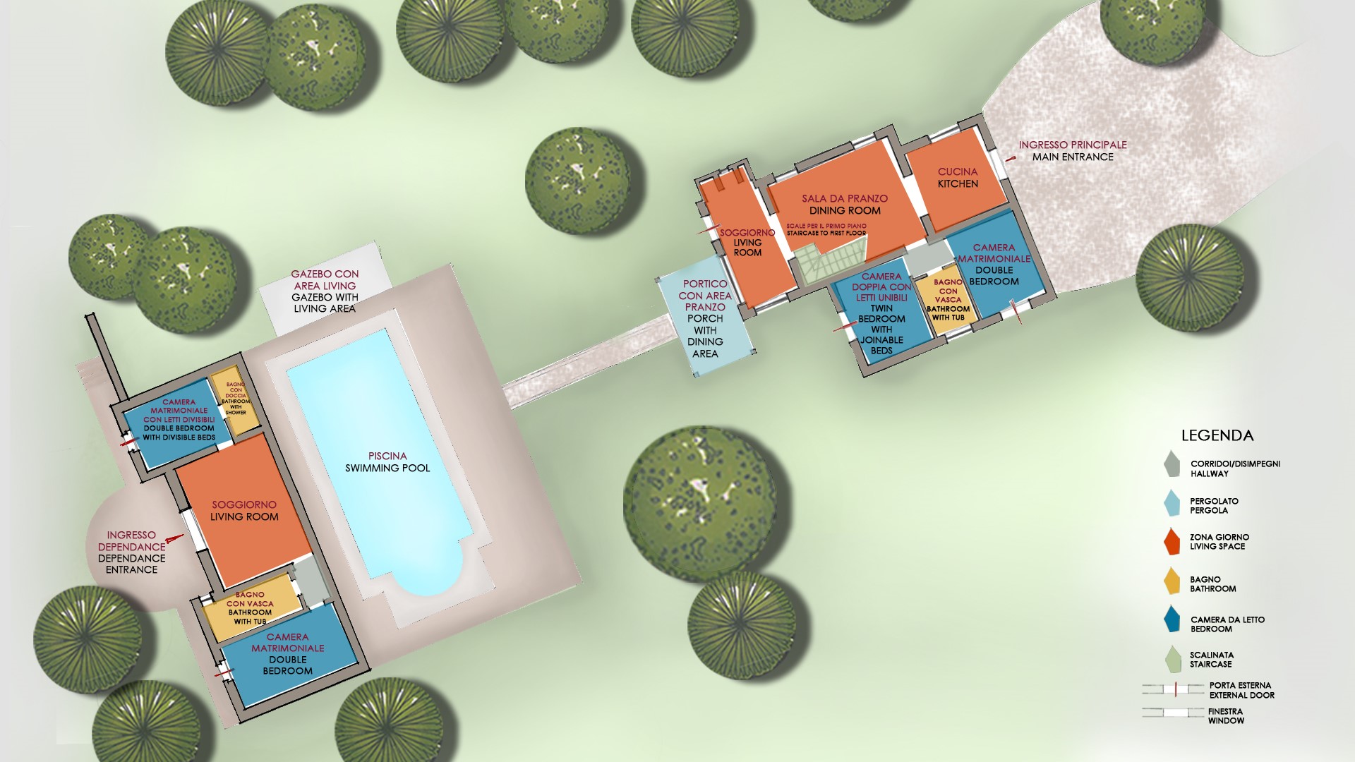 Please notice that photos are taken in spring, therefore flower blossoming, and the colours of the gardens' grass could be different at the moment of your arrival at the villa.