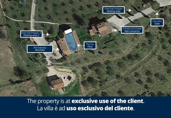 The completely enclosed grounds (wire mesh with a minimum height of 1.80 m) of Casal del Salice extend for approximately 3 hectares, a part of which are cultivated with a manicured, mostly flat, lawn alternating with fruit trees such as figs, apricots, plums, peaches, medlars and cherries as well as olive, almond and walnut trees, willows, rosemary, sage, thyme and many types of flowers. Outside the French window of the lounge/dining room/kitchen is a large portico with wooden-beamed roof, furnished with chairs, table and a mobile barbecue. In the evening the outdoor lights positioned in various strategic areas render the garden even more fascinating, both around the pool and in the rest of the property. On the other side of the house, outside the entrance to the annex, are the animal enclosures, where horses, donkeys, peacocks, goats, birds of various kinds and owner's dogs all live peacefully together. The villa has an entrance with automatic gate and a 5-car open-air parking area.