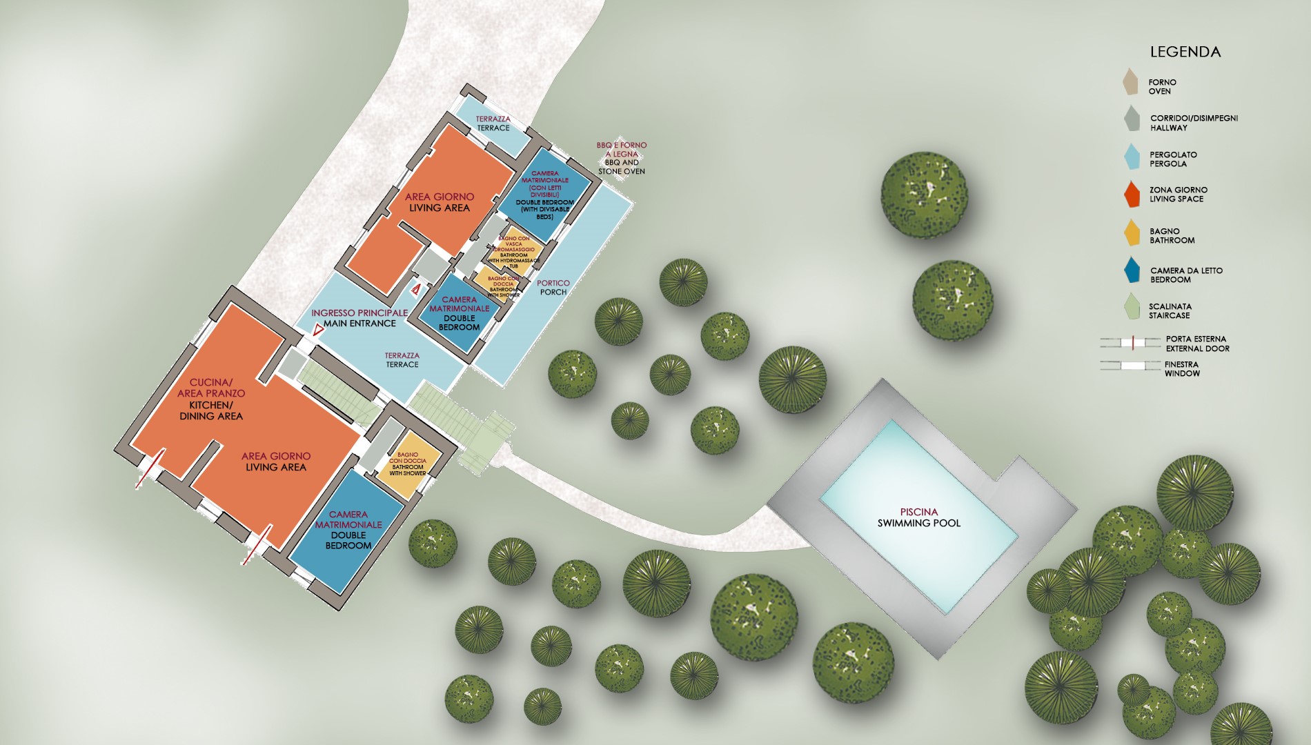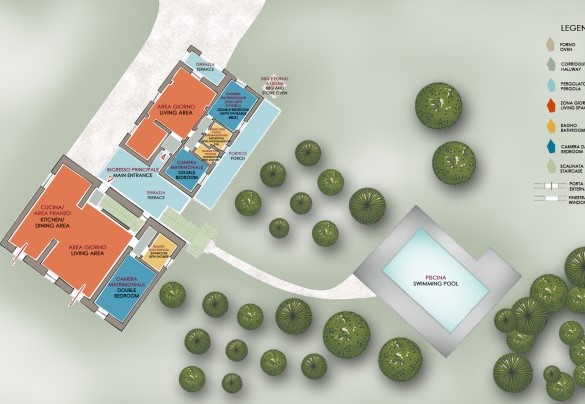 Le Residenze dei Potti is surrounded by a splendid fenced garden, for the most part flat, of 3000 square metres of green lawn with old olive trees, hedges, tall trees, vases of fragrant, brightly-coloured flowers and roses growing everywhere. The beautiful large portico (185 square meters), located just outside the door of the kitchen and living room and equipped with brick barbecue, wood oven, tables, chairs and sofas, allows you to relax in all tranquillity and admire the fabulous view over the surrounding hills. In the evening the external lights set in various strategic places render the garden even more fascinating, both around the pool and in the rest of the property, in short, the ideal place for admiring enchanting sunsets. From the automatic iron gate, the driveway, flanked by olive trees, leads to the parking area with space for 4 cars in the basement garage and for 3 cars outdoors.