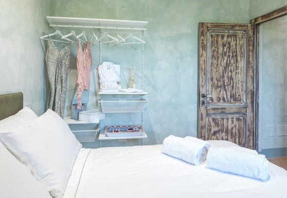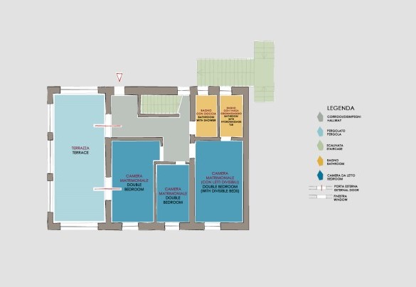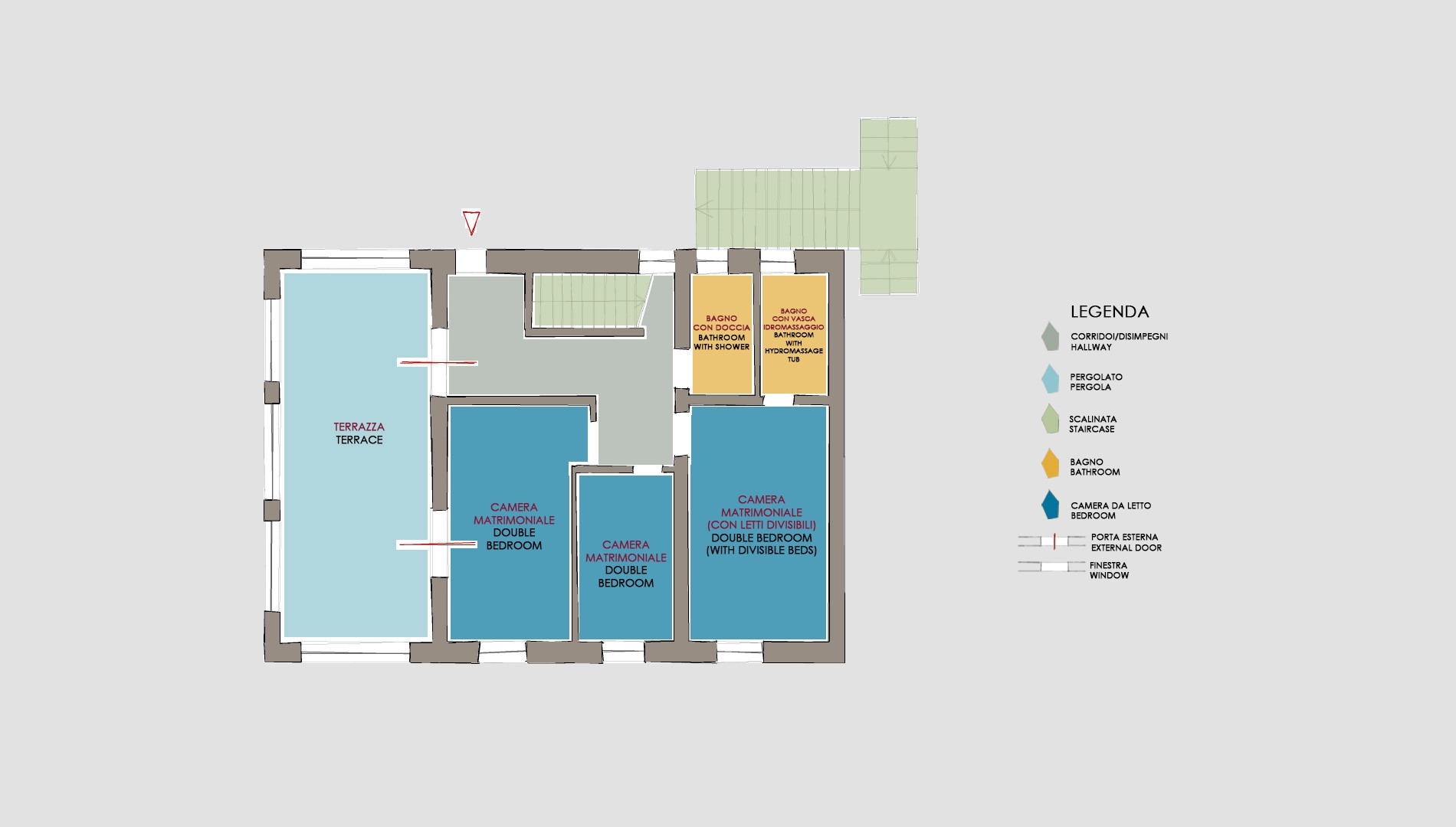 MAIN HOUSE.The main door leads to the large kitchen with open-plan dining area and large living room with fireplace. The ground floor is completed by a double bedroom with ensuite bathroom with shower. From the living room a brick staircase leads up to the first floor, which can also be reached via an external staircase, consisting of a double bedroom, with divisible beds and ensuite bathroom with whirlpool tub, two double bedrooms (one with a large terrace) which share a bathroom with shower.