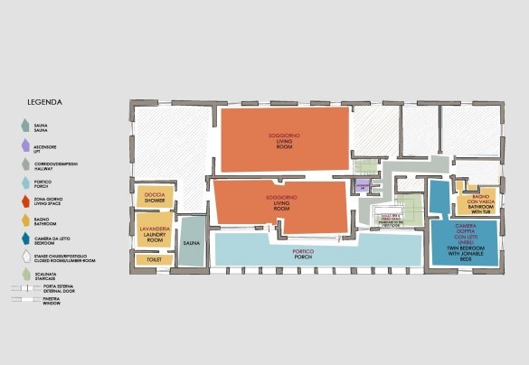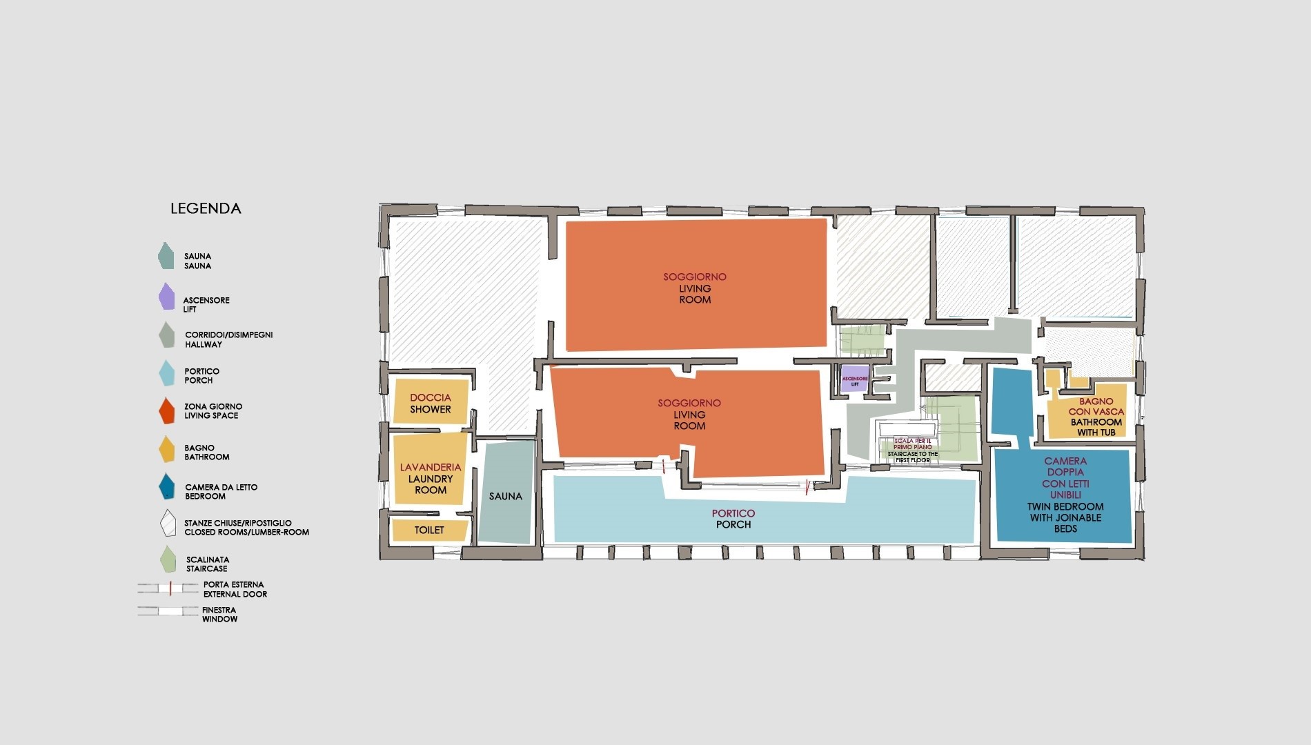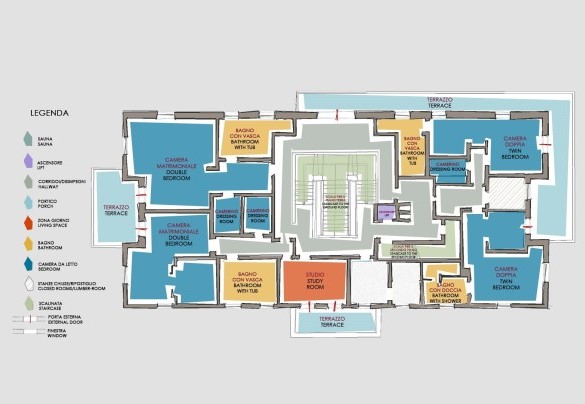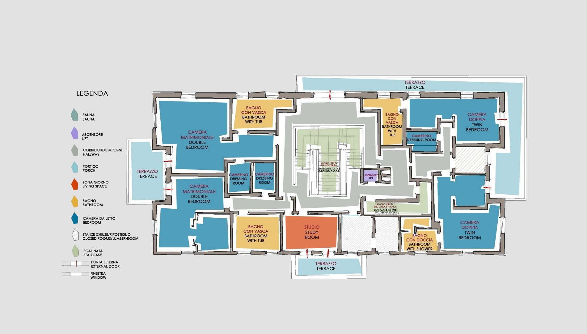 The villa has four floors with an elevator and a dumbwaiter. A large flight of stairs leads to the main entrance with, on the left, the reading room with sofa and armchairs and the main living room with sofas, armchairs, chairs and tables, piano and, in the passage towards the dining room, under the imposing staircase, a bar. To the right of the entrance, on the other hand, is a guest bathroom, a dining room, an open-plan area with sitting room and dining room with French windows leading directly out to the portico with the outdoor dining area. This floor is completed by a fully-equipped professional kitchen with brick-built barbecue. A 25 step staircase in marble and brass leads up to the first floor which stretches around the staircase: it consists of a study/library, four bedrooms (some with terrace), three double and one twin with joinable beds, all with en-suite bathroom (three with tub and one with shower). A wooden staircase leads up to the second floor which consists of a passage-lounge with sofas and armchairs leading out to the large terrace and a twin with joinable beds with en-suite bathroom with tub. This floor is completed by a laundry room with washing machine and dryer and an area with sauna and bathroom with shower. Going down 25 steps from the main entrance on the ground floor you come to the basement, composed of a large taverna with fireplace, billiard table, conversation area with sofas, armchairs and coffee tables, a fully-equipped bar, gaming tables and a guest bathroom.
