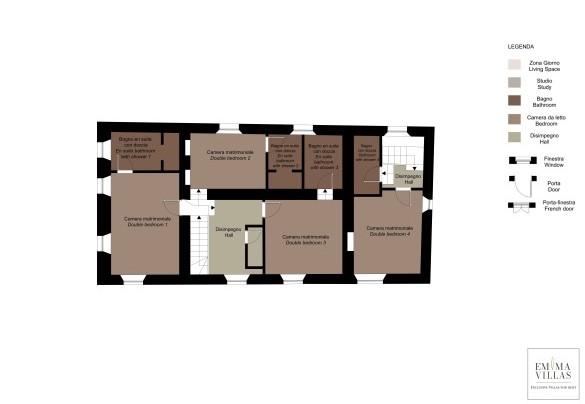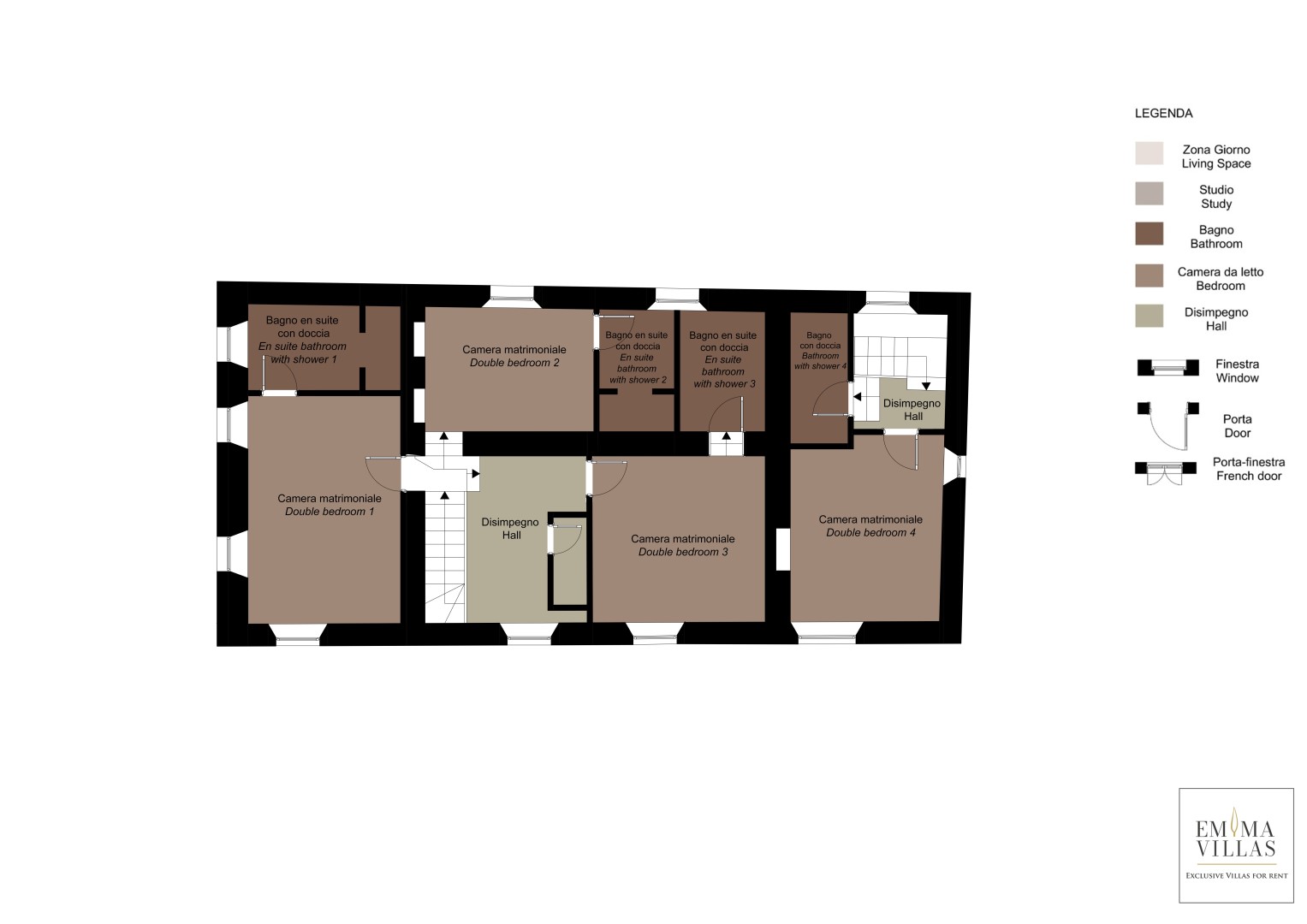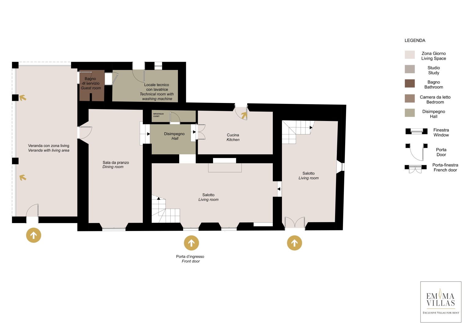 La villa si sviluppa su due livelli, collegati da scale interne. PIANO TERRA – Ingresso principale nel soggiorno con camino ornamentale; ingresso secondario che apre ad un salotto con smart TV; cucina; ripostiglio; sala da pranzo; veranda con zona living; bagno di servizio; lavanderia. PIANO PRIMO (mansardato, accessibile da due rampe di scale interne) – Una camera matrimoniale con letto largo 1.40m (adatto per due bambini o per un adulto ed un bambino) con bagno en suite con doccia; due camere matrimoniali con bagno en suite con doccia; una camera matrimoniale con letto king size con bagno adiacente con doccia. Nota: sono presenti alcuni gradini per accedere alle camere e ai bagni.