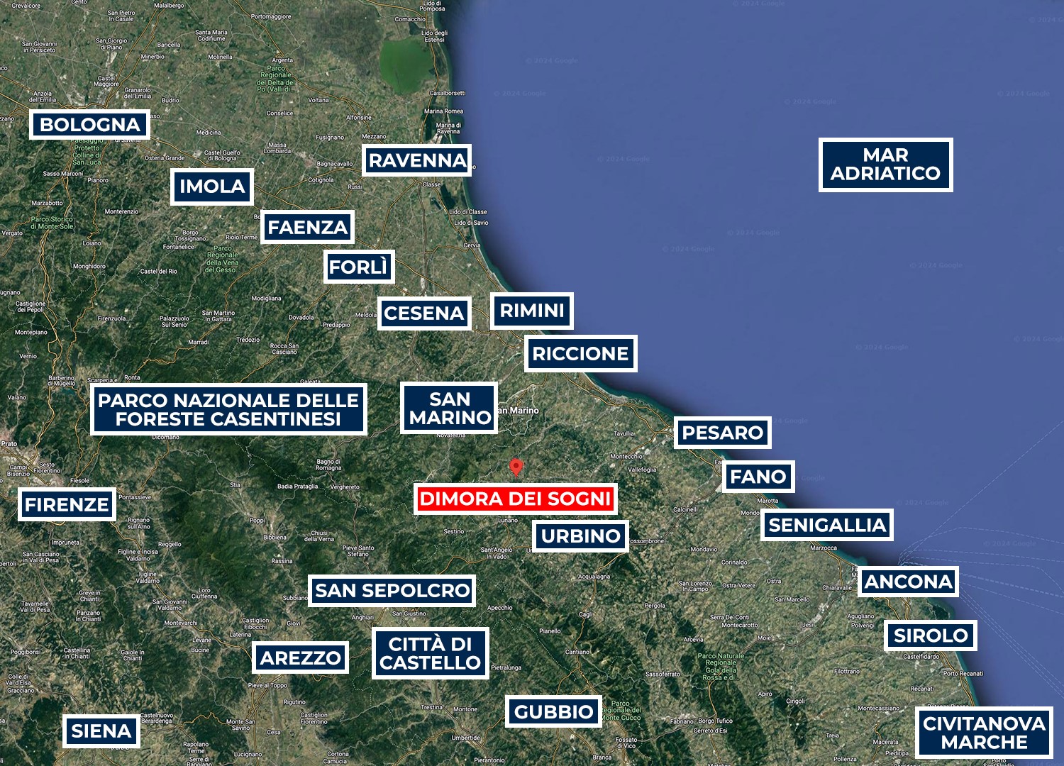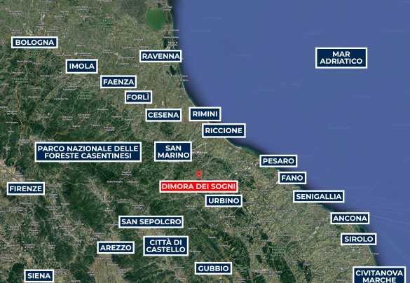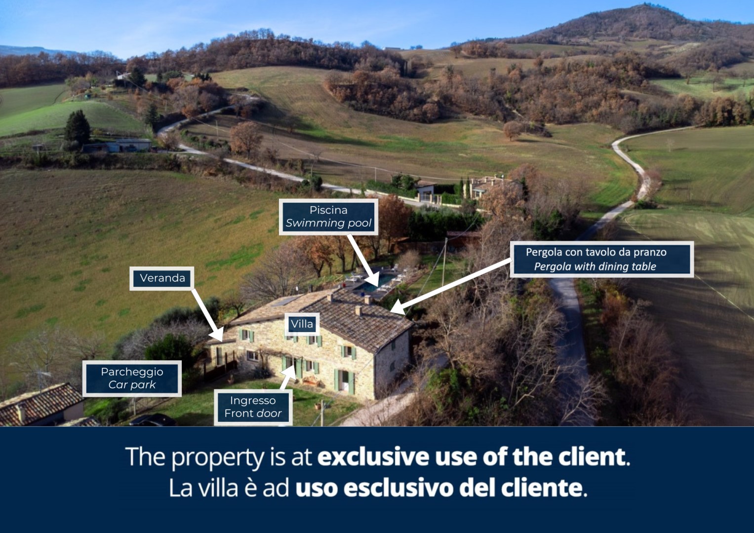 La villa gode inoltre di una posizione ideale per raggiungere borghi storici e città d’arte come Urbino, San Leo, Pennabilli e la Repubblica di San Marino, oltre alle Terme di Monte Grimano e alla Riviera Adriatica con Rimini, offrendo tranquillità e numerose possibilità di escursioni giornaliere.