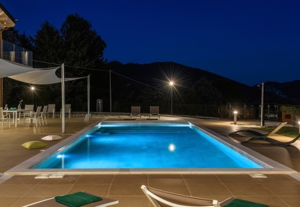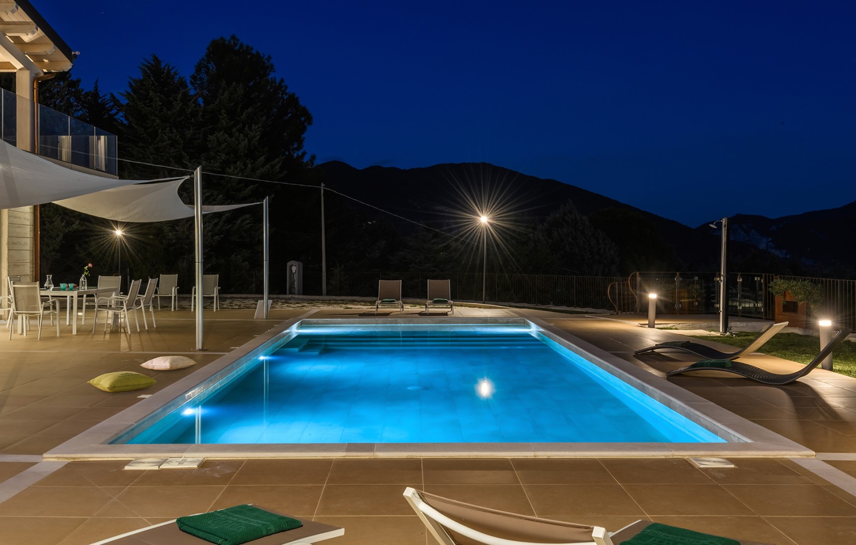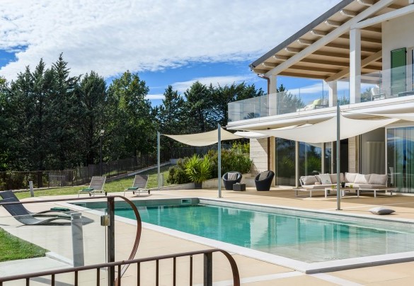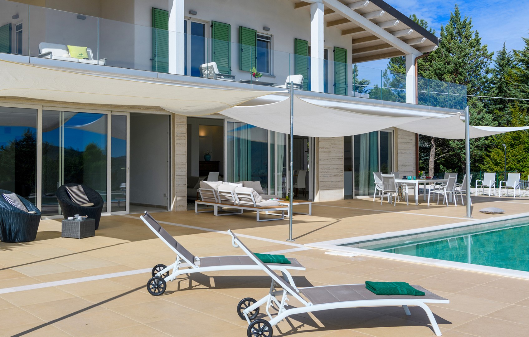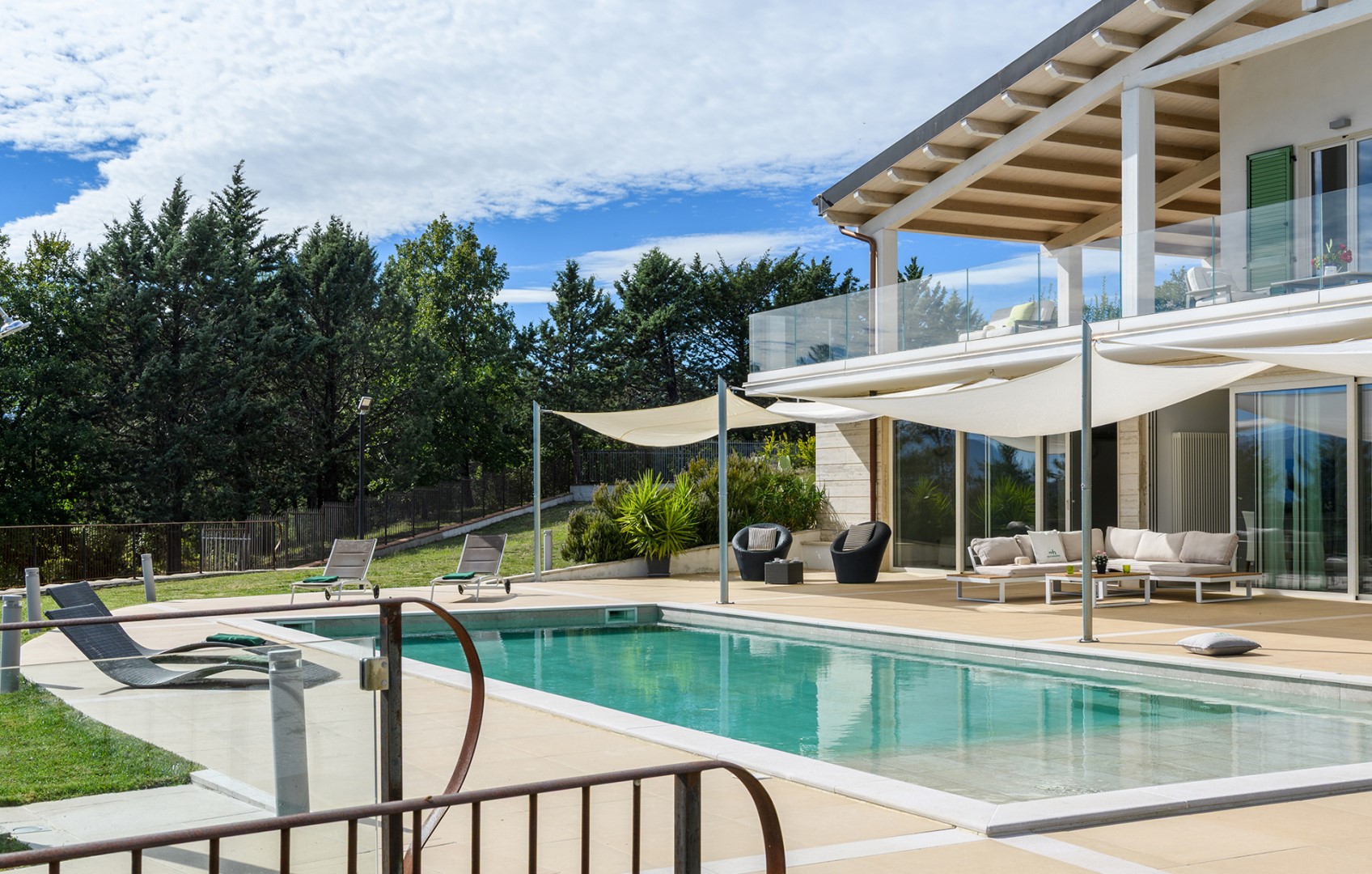 La piscina si trova nel giardino, a pochi passi dalla villa, ed è circondata da una terrazza pavimentata con vista panoramica sulla campagna e sulle colline.