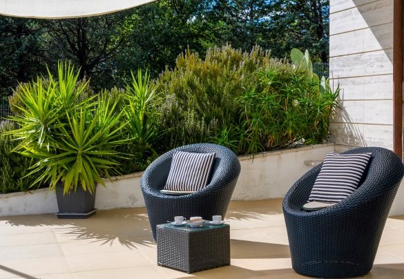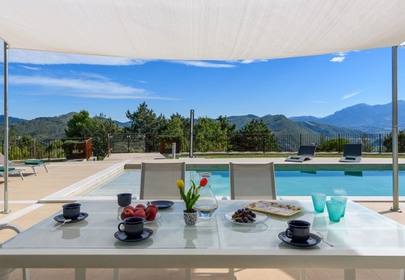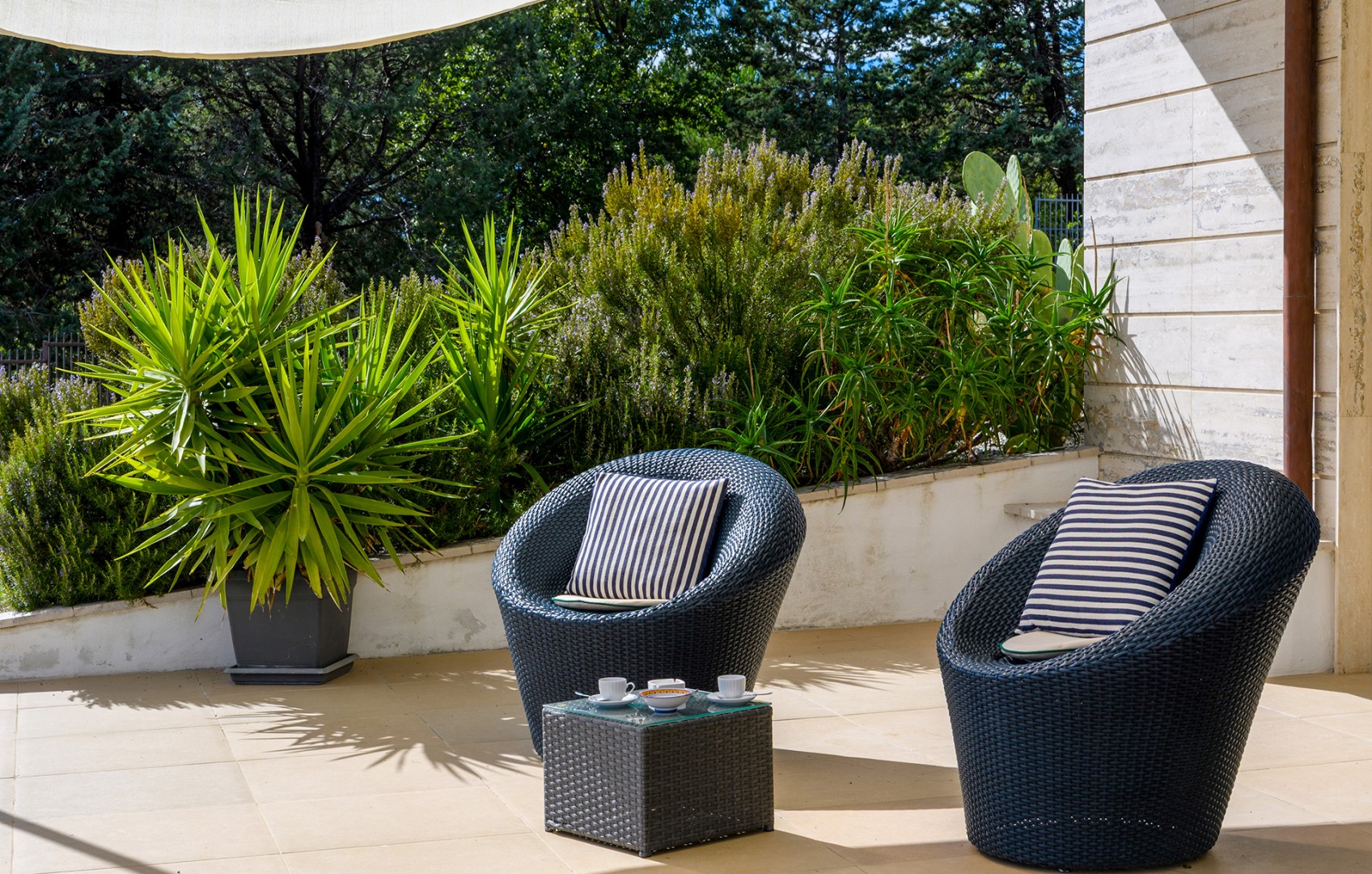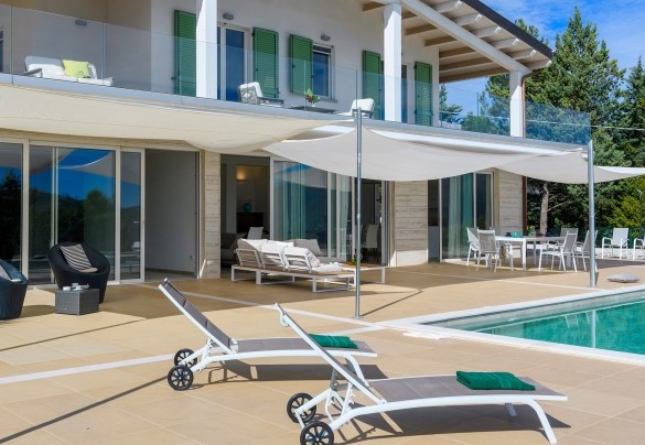 Una terrazza liscia al piano terra è arredata per vivere all’aperto, con tavolo da pranzo ombreggiato e area salotto tra la villa e la piscina. Al piano superiore si trova una terrazza panoramica che circonda la casa, arredata con divani da esterno. Il giardino è completamente recintato e include anche una terrazza solarium pavimentata attorno alla piscina e una colonnina per la ricarica di auto elettriche.