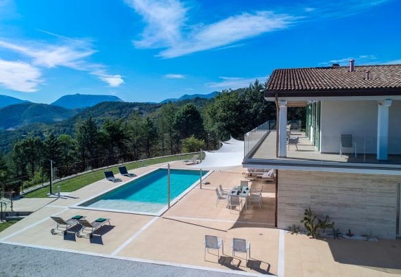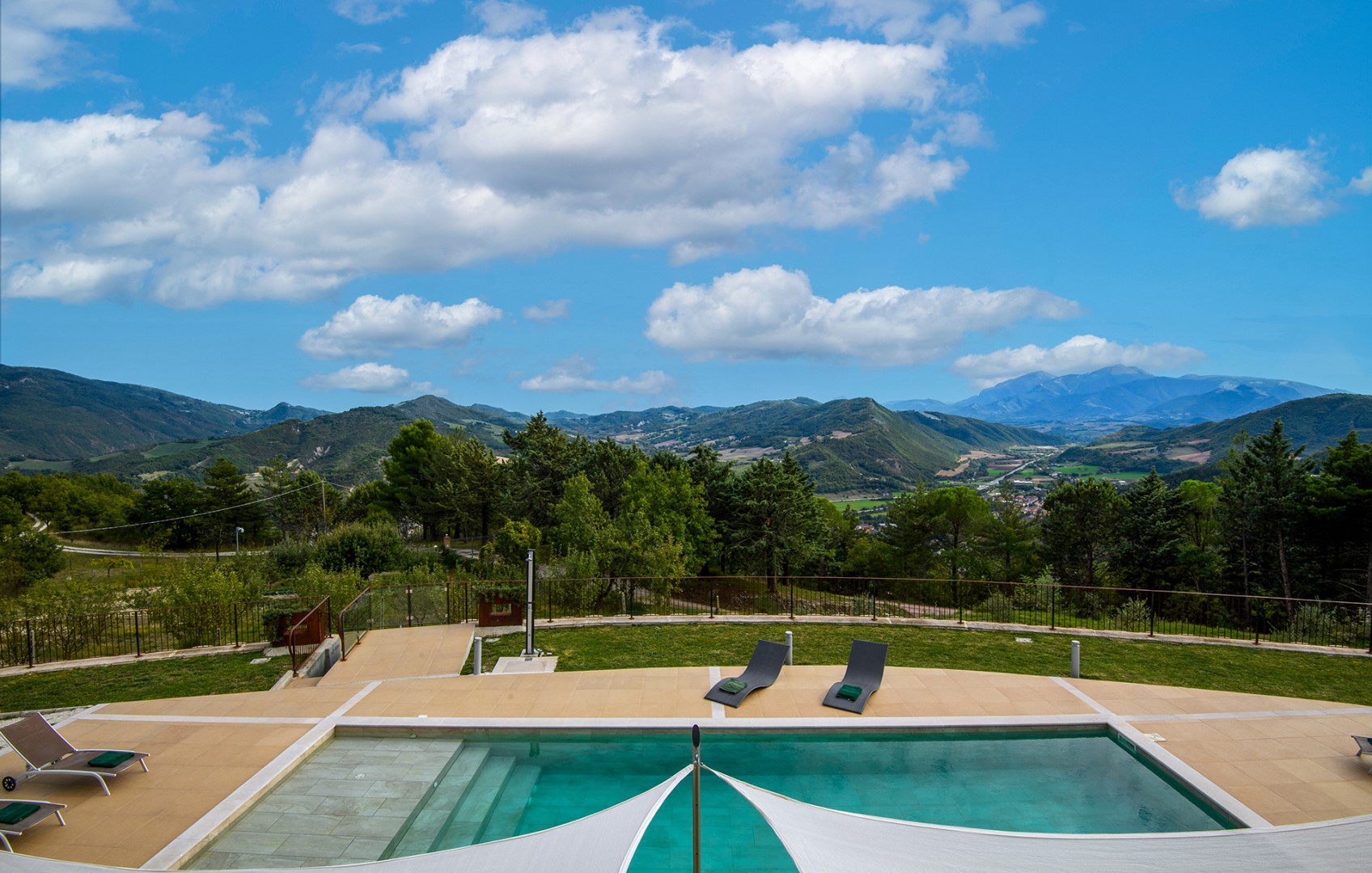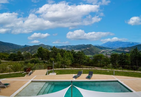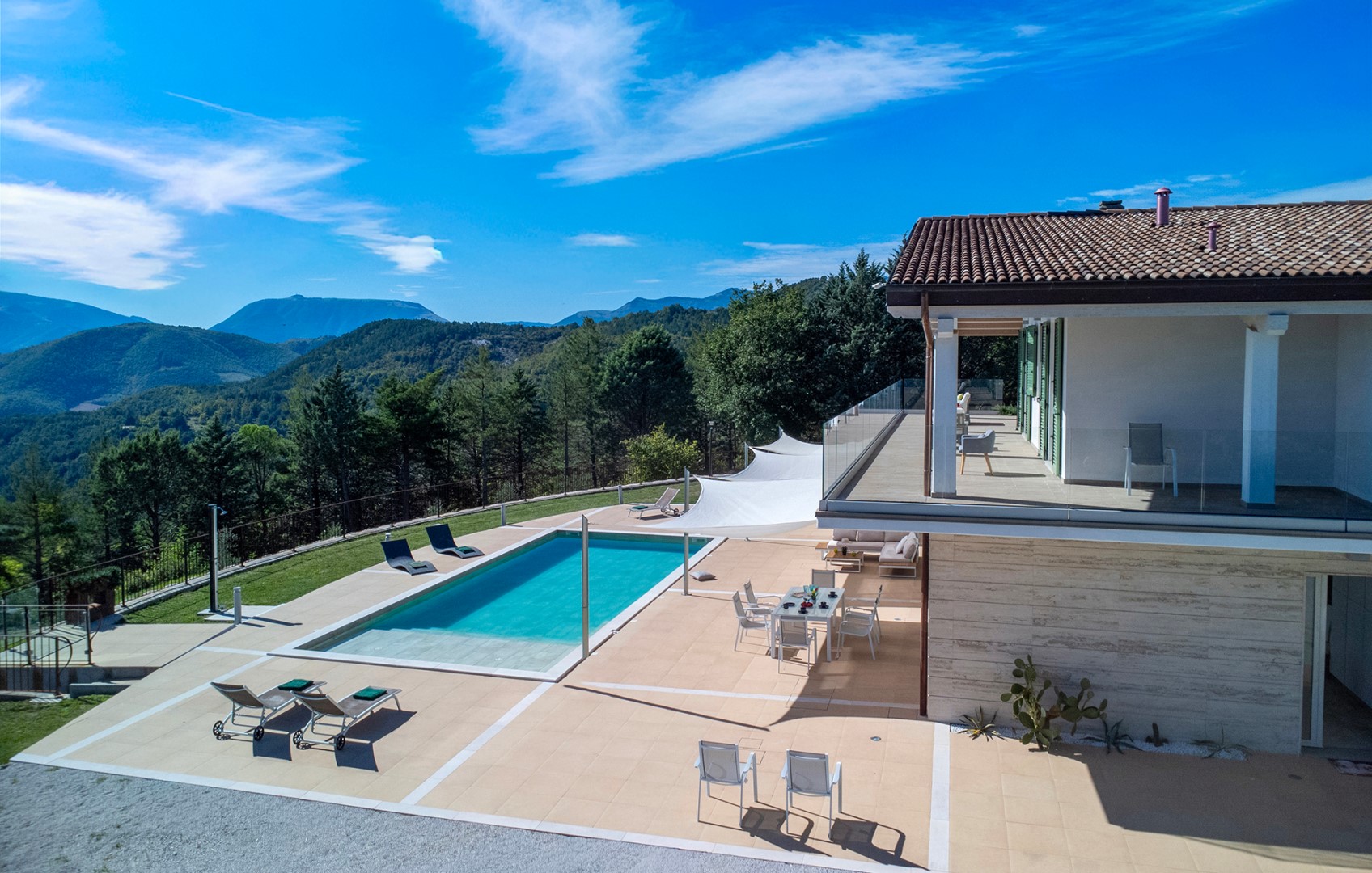 STRUTTURA PRIVATA (solo locazione). Dimora Montefalcone è una villa contemporanea e unica nel suo genere, dotata sia di piscina interna che esterna. Situata in posizione rialzata nei pressi di Acqualagna, è circondata da prati, alberi e da una vista panoramica sulla campagna e sulle montagne in lontananza.