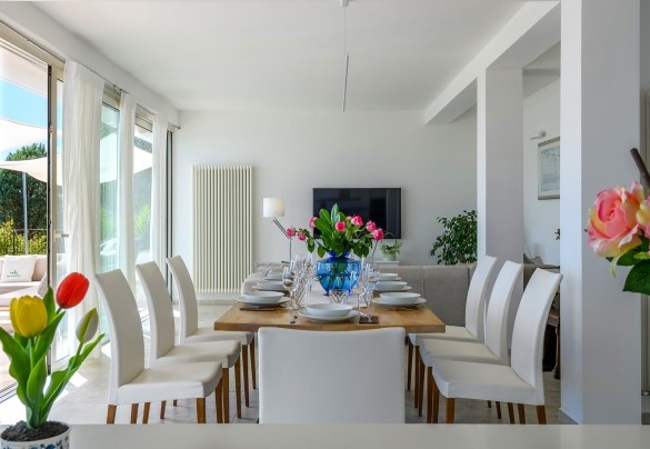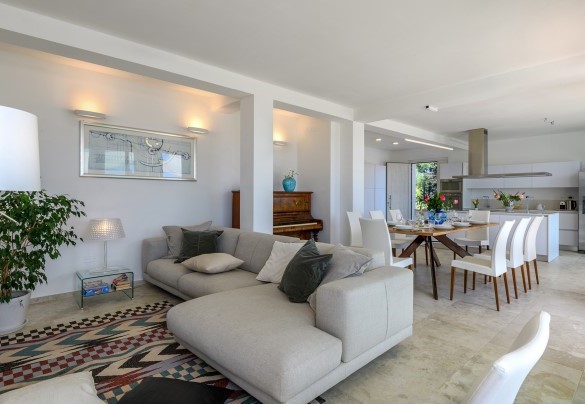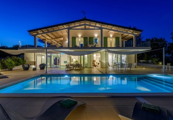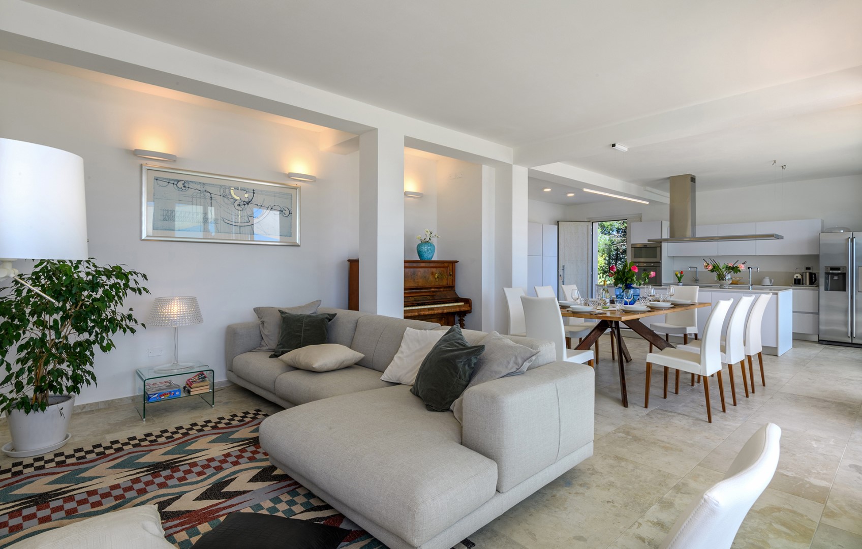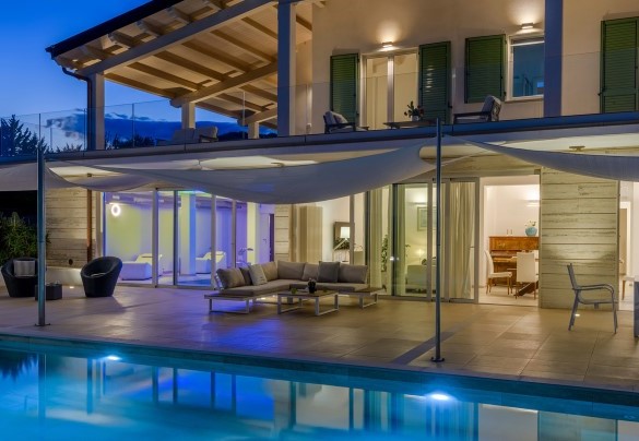 Progettata per offrire il massimo del relax e della convivialità, la villa presenta ambienti luminosi, moderni e ariosi, quattro camere e quattro bagni. All’esterno, una terrazza solarium circonda la piscina, mentre un’area ombreggiata con salotto e zona pranzo collega la casa al giardino. Il primo piano dispone di un’ampia terrazza panoramica che avvolge la villa, arredata con comode sedute da esterno. Tra i comfort aggiuntivi spiccano una sauna e una piscina interna con nuoto controcorrente, utilizzabile tutto l’anno.