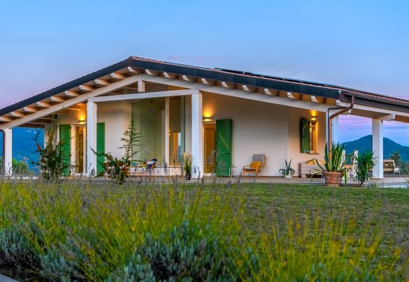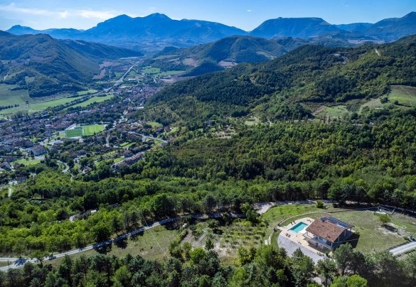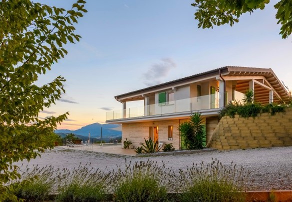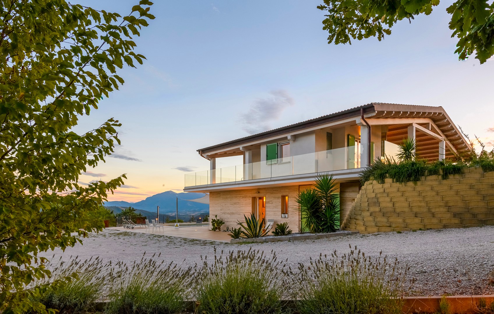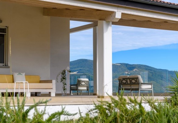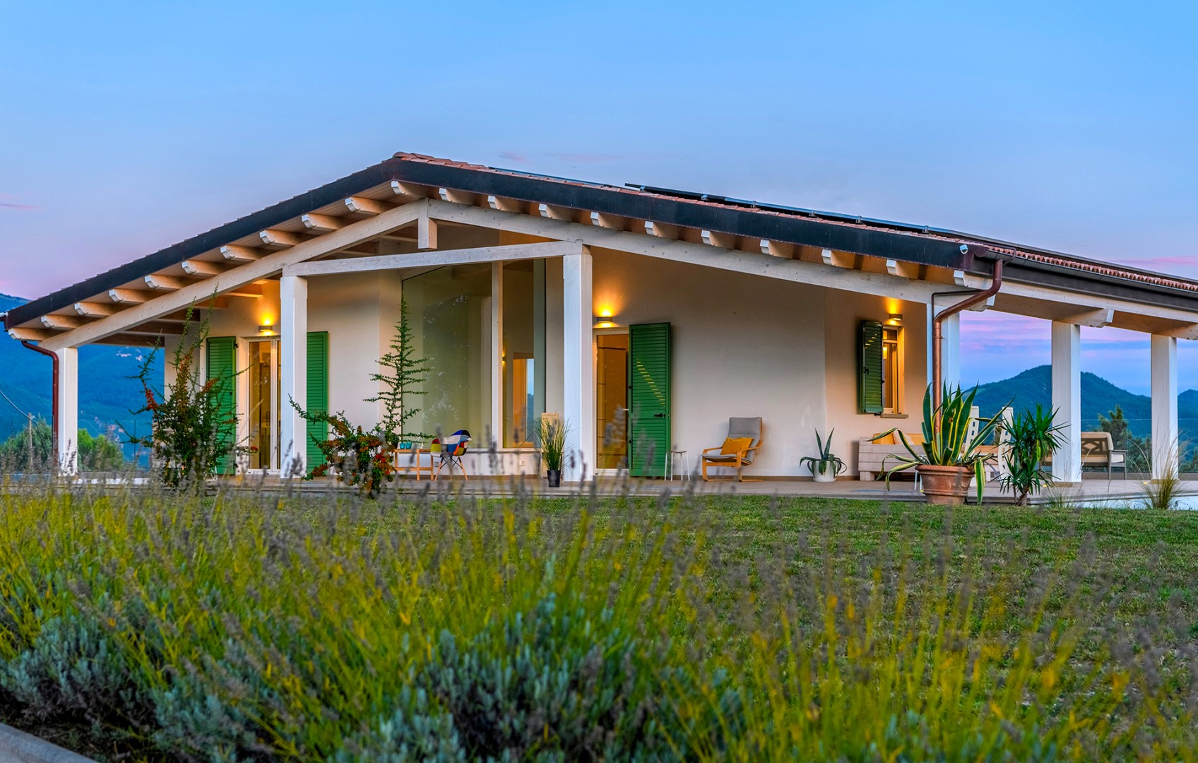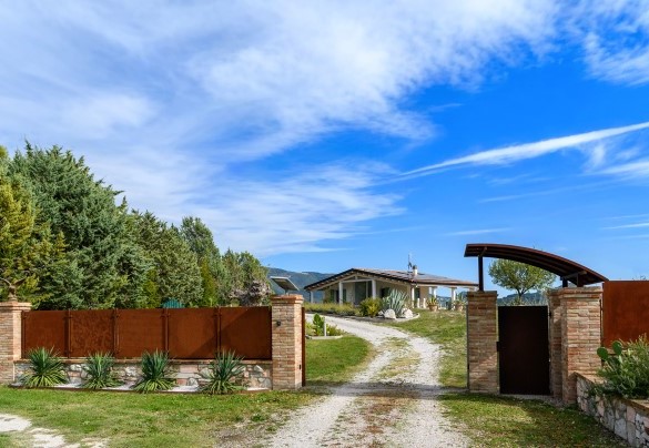 La villa è immersa in un ampio giardino con prato delimitato da alberi. La posizione rialzata garantisce una vista aperta sulla campagna circostante e sulle montagne all’orizzonte.