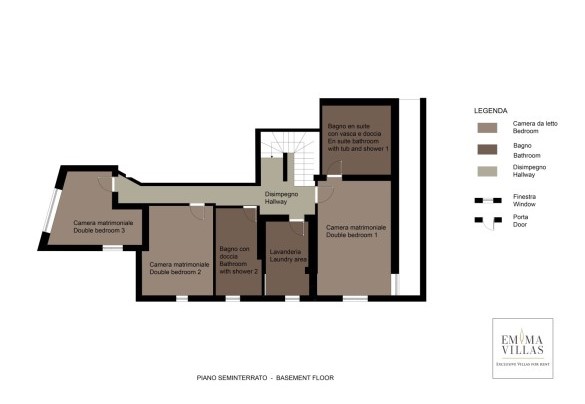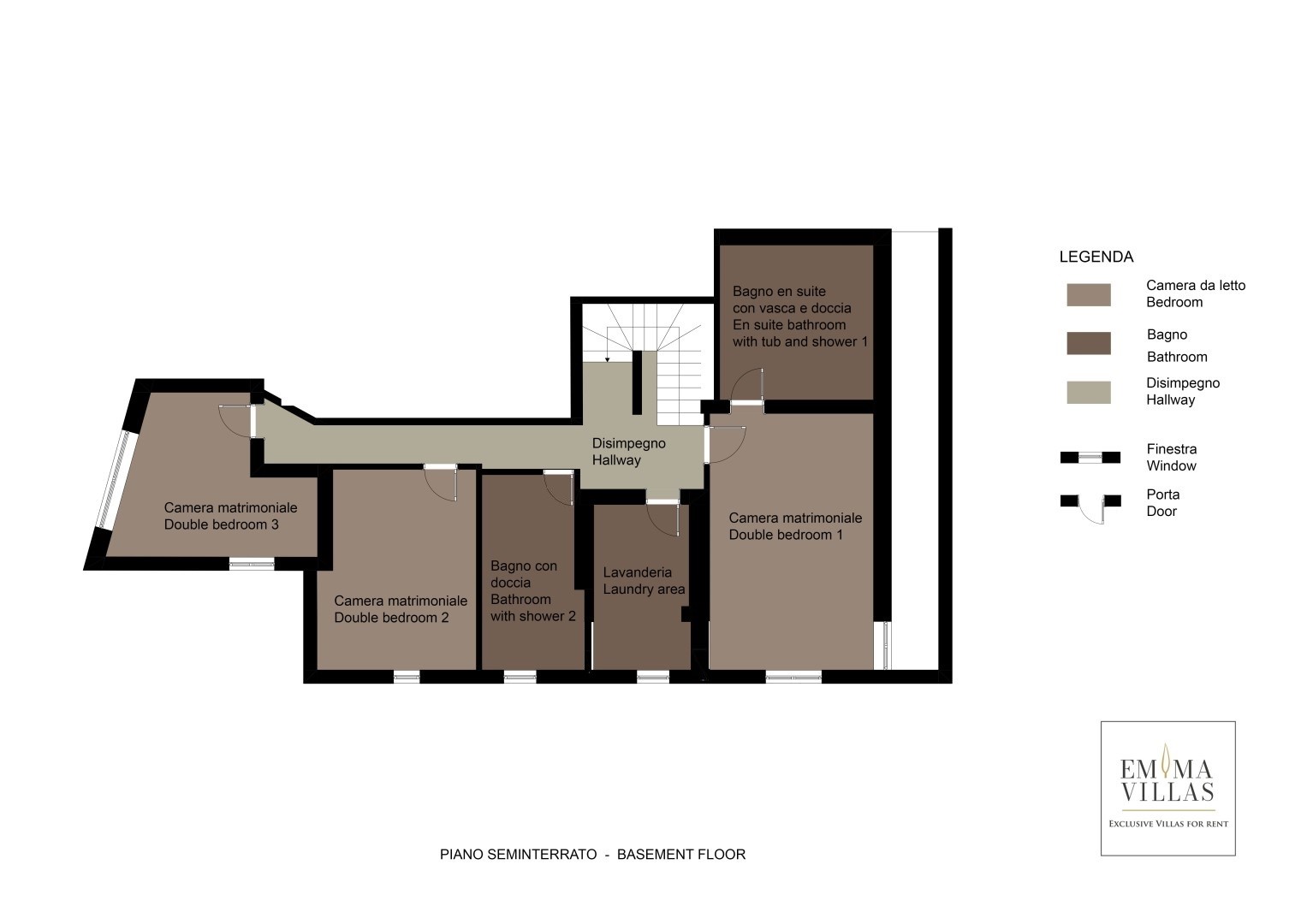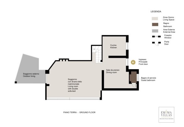 La villa si sviluppa su due livelli collegati da una scala interna di 17 gradini, per una superficie totale di circa 200 mq. PIANO TERRA – Accessibile dall’esterno tramite 9 gradini; soggiorno e sala da pranzo open space con divano letto matrimoniale e cucina; bagno di servizio; accesso alla terrazza sullo stesso livello. PIANO TERRA INFERIORE – Una camera matrimoniale con bagno en-suite con vasca e doccia; due camere matrimoniali, di cui una con accesso diretto al giardino tramite tre gradini; bagno con doccia; disimpegno esterno con accesso alla lavanderia.