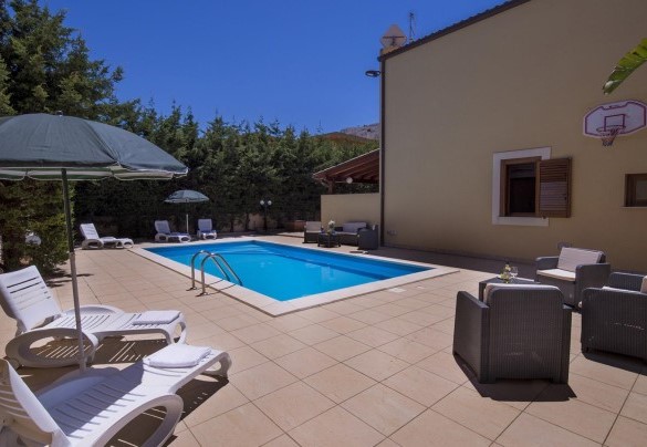 La piscina raggiungibile dal viale davanti la casa o dal retro, misura 8 x 4 m. Ha una profondità variabile da 1,10 m a 2,10 m, è depurata con cloro, rivestita in resina, con illuminazione interna ed esterna e vi si può accedere tramite i gradoni posti nell’angolo. L’area solarium è pavimentata in pietra ed è arredata con lettini, ombrellone, divanetti e poltrone. La piscina è a disposizione degli ospiti dall’ultimo sabato di aprile al primo sabato di ottobre.