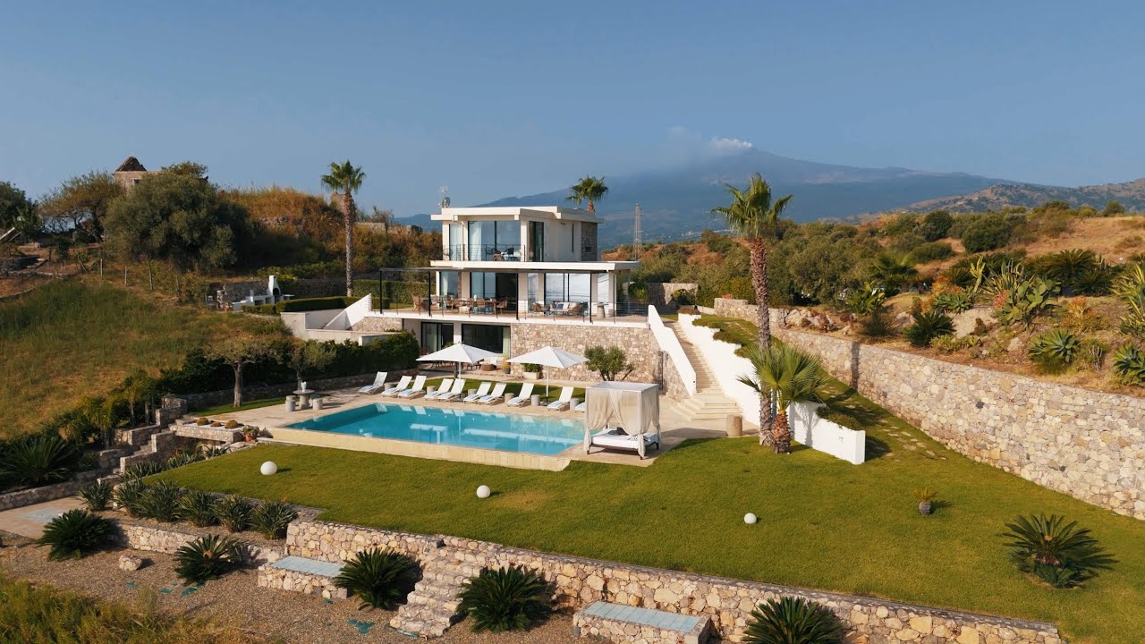 L’esterno della proprietà è caratterizzato da un lotto di circa 2000 mq di cui una zona parcheggio che può ospitare comodamente fino a 3 auto. La parte principale del giardino si sviluppa sul lato panoramico della proprietà dove è allocata anche la piscina. Quest’area è coltivata a prato inglese, con la presenza anche di siepi di arbusti e piante tipiche della macchia mediterranea. La grande terrazza del piano principale, con vista spettacolare sul mare dei Giardini Naxos, è arredata con una zona living esterna, una zona pranzo ed è completata da un barbecue.