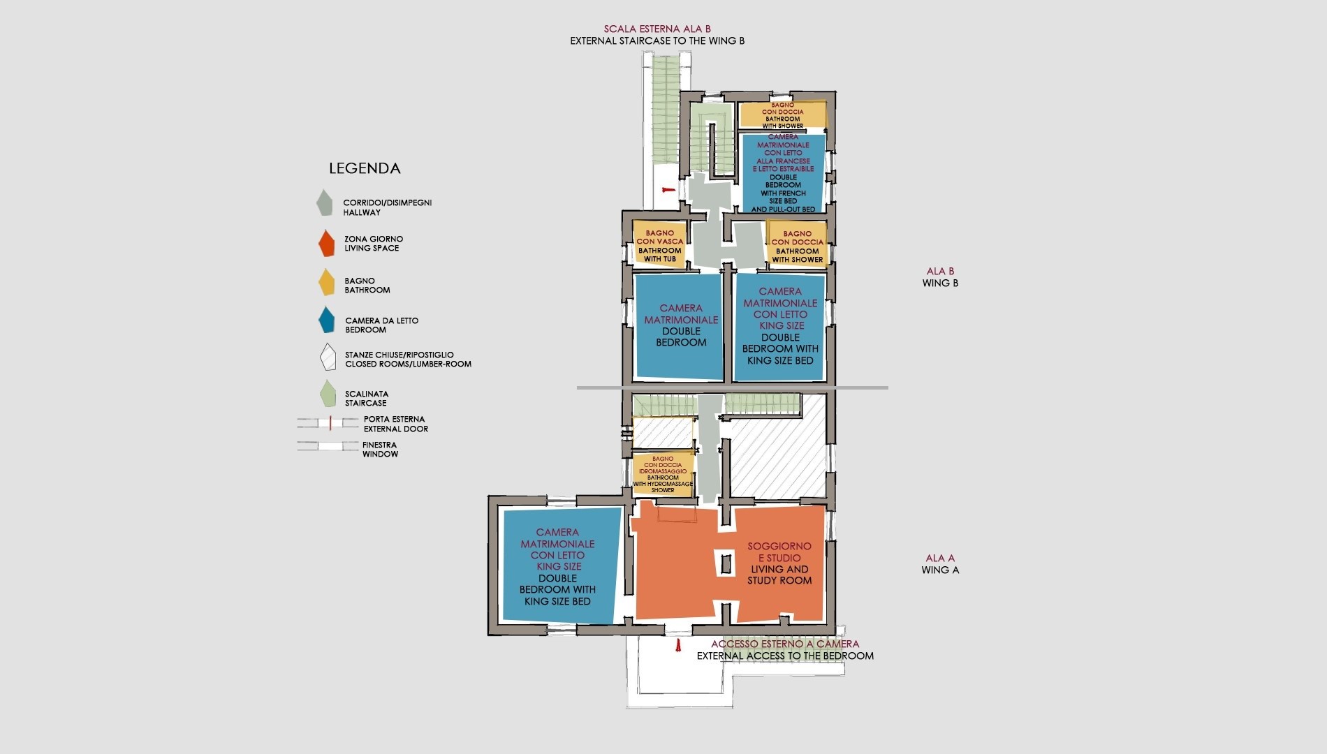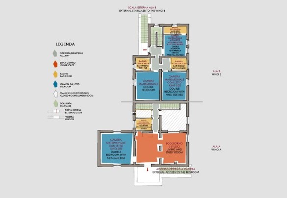 Il casale è disposto su tre piani, il terzo piano è costituito dalla torretta. Dall’entrata principale, situata a piano terra, si accede all’ingresso principale costituito da un ampio salotto da cui si snodano la sala biliardo, la sala da pranzo, la grande cucina, la sala TV e lo studio. Completano questo piano tre bagni di servizio. Dal piano terra partono due rampe di scale che accedono al primo piano suddiviso in due diverse ali separate al suo interno. Una delle due ali è composta da due piani (primo piano e secondo piano). Nel primo piano si trovano una grande suite composta da camera matrimoniale con king size bed, salotto, studio e un bagno con doccia idromassaggio, salendo una scala si raggiunge il secondo piano in cui si trova una camera matrimoniale con bagno en-suite con vasca. L’altra ala del primo piano è composta da una camera matrimoniale con king size bed con bagno en-suite con doccia e una camera matrimoniale servita da un bagno con vasca. Completa questa ala una camera matrimoniale con bagno en-suite con doccia. Dallo studio che si trova al piano terra, tramite una scala si raggiunge il seminterrato in cui si trova la sala fitness. Scendendo ancora degli scalini si raggiunge il centro benessere, dotato di zona bagno turco, area vasca idromassaggio, sauna, saletta massaggi e un bagno con doccia.