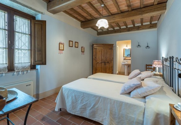 La proprietà si dispone su due piani e comprende il casale principale con le zone comuni e cinque annessi, due al piano terra e tre al primo piano. La struttura centrale cui si accede dall’ingresso principale ospita un ampio soggiorno, la sala da pranzo con caminetto e la cucina attrezzata, collegate tra loro da volte. Completa l’ambiente, un bagno di servizio. All'esterno del piano terra, partono due rampe di scale poste, rispettivamente, alla sinistra e alla destra dell’ingresso principale che conducono ai primi due annessi al primo piano. ANNESSO 1. Si compone di due appartamenti comunicanti tra loro. Uno è composto da una camera matrimoniale e una camera doppia (con letti unibili), entrambe con bagno en-suite con doccia. L'altro appartamento è composto da una camera matrimoniale con un letto singolo e bagno en-suite con doccia. ANNESSO 2. Si trova sullo stesso livello, di fronte all’ingresso del primo annesso, ed è composto da una camera doppia (con letti unibili) e da una camera matrimoniale, ambedue con bagno-en suite con doccia. Una scala a chiocciola conduce alla zona soppalcata con letto singolo (su richiesta è a disposizione il secondo letto estraibile) e un bagno con doccia. ANNESSO 3. Sempre sulla facciata anteriore della villa l’altra scala conduce al terzo annesso, nel quale si trovano uno studio con letto singolo e secondo letto estraibile, una camera matrimoniale e un bagno con doccia. Dal retro della villa si accede, infine, agli ultimi due annessi, posti rispettivamente uno a sinistra e uno a destra del corpo principale. ANNESSO 4. Si compone di una camera matrimoniale e di una camera doppia (con letti unibili cui è possibile accedere anche direttamente dall’esterno), entrambe con bagno-en suite con doccia. ANNESSO 5. Nell’ultimo annesso, infine, è collocata una camera matrimoniale e un bagno con doccia. Ogni annesso è provvisto di un piccolo soggiorno e di angolo cottura. La stanza della lavanderia si trova in un annesso adiacente al casale.