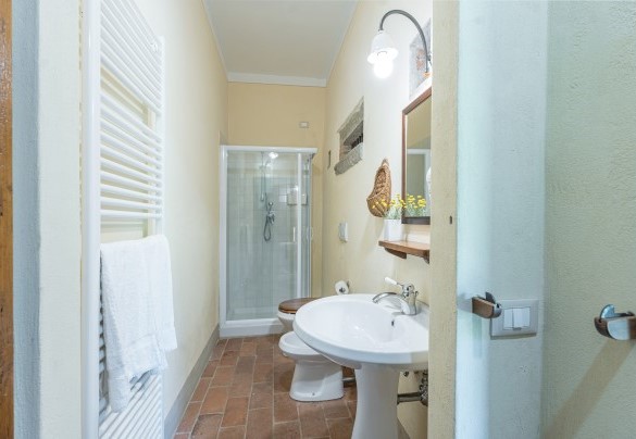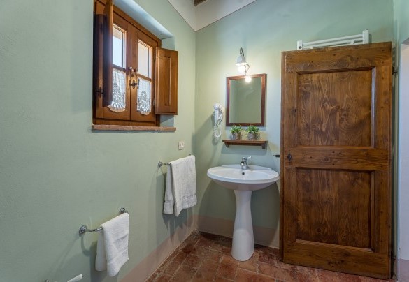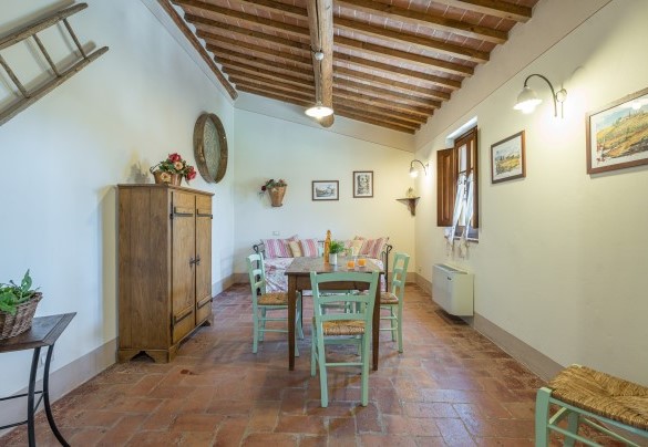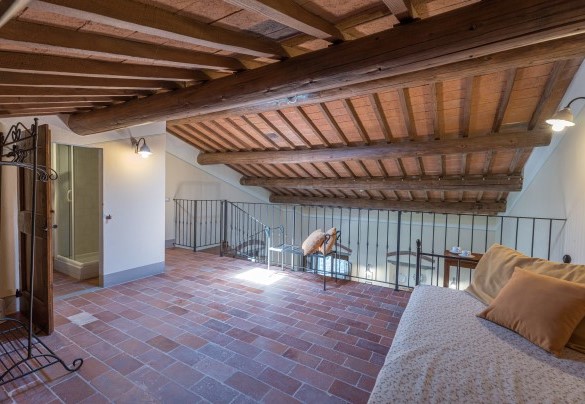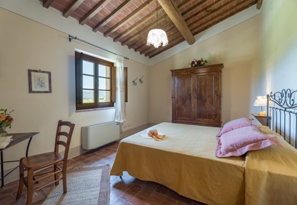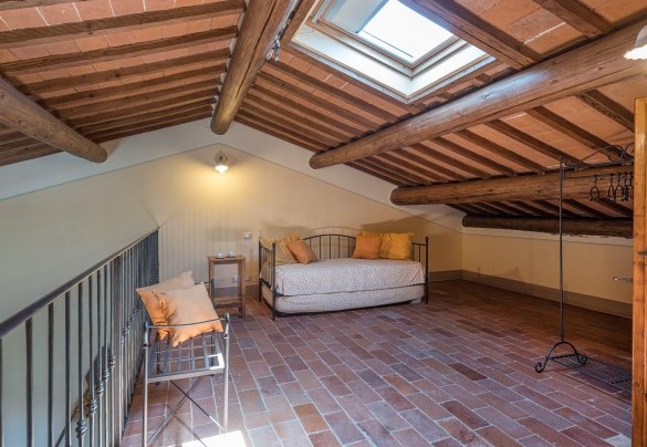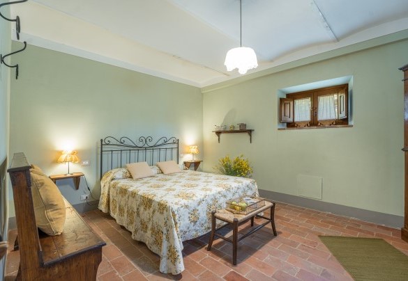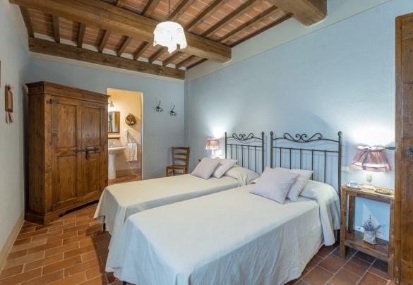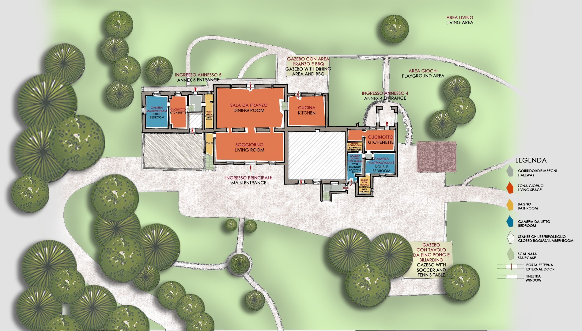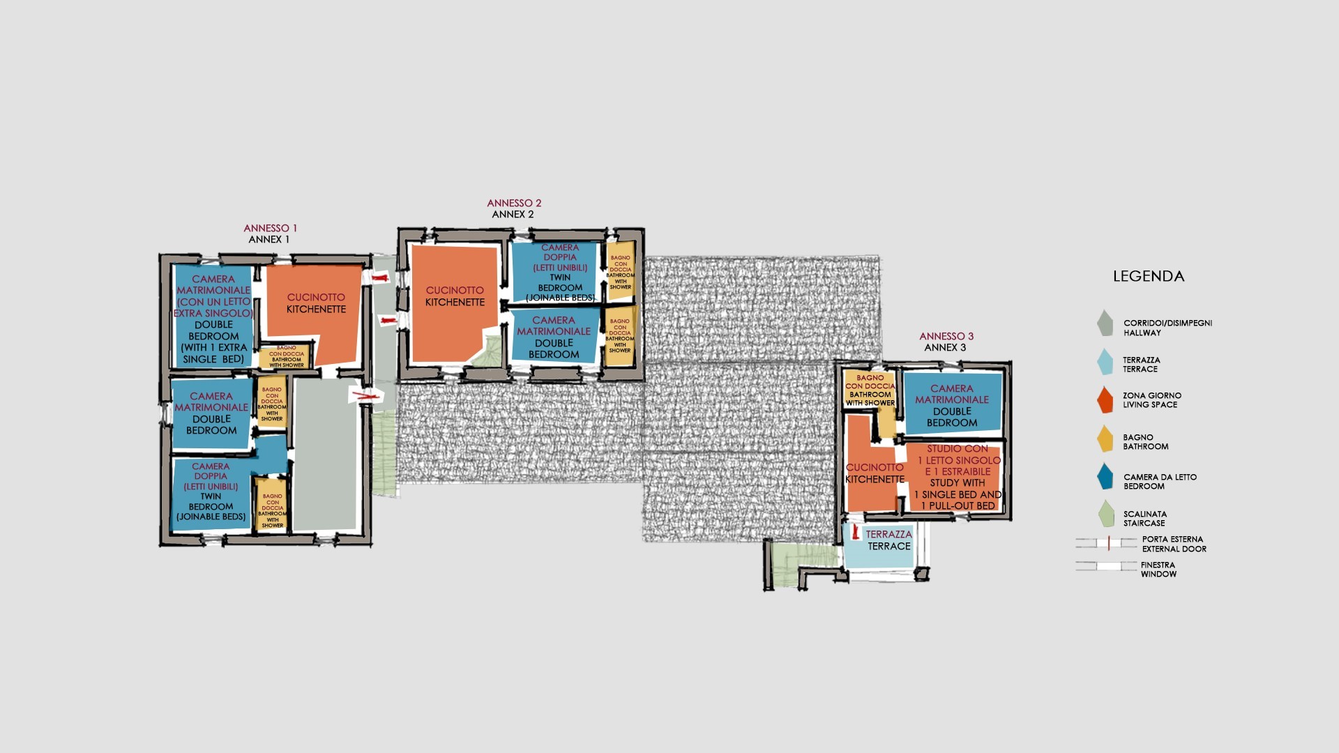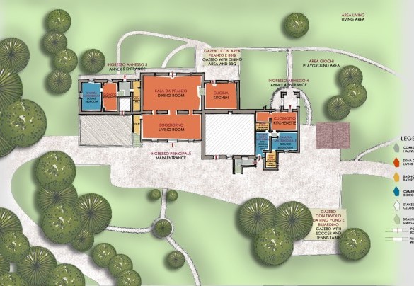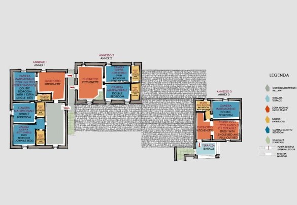 La proprietà si dispone su due piani e comprende il casale principale con le zone comuni e cinque annessi, due al piano terra e tre al primo piano. La struttura centrale cui si accede dall’ingresso principale ospita un ampio soggiorno, la sala da pranzo con caminetto e la cucina attrezzata, collegate tra loro da volte. Completa l’ambiente, un bagno di servizio. All'esterno del piano terra, partono due rampe di scale poste, rispettivamente, alla sinistra e alla destra dell’ingresso principale che conducono ai primi due annessi al primo piano. ANNESSO 1. Si compone di due appartamenti comunicanti tra loro. Uno è composto da una camera matrimoniale e una camera doppia (con letti unibili), entrambe con bagno en-suite con doccia. L'altro appartamento è composto da una camera matrimoniale con un letto singolo e bagno en-suite con doccia. ANNESSO 2. Si trova sullo stesso livello, di fronte all’ingresso del primo annesso, ed è composto da una camera doppia (con letti unibili) e da una camera matrimoniale, ambedue con bagno-en suite con doccia. Una scala a chiocciola conduce alla zona soppalcata con letto singolo (su richiesta è a disposizione il secondo letto estraibile) e un bagno con doccia. ANNESSO 3. Sempre sulla facciata anteriore della villa l’altra scala conduce al terzo annesso, nel quale si trovano uno studio con letto singolo e secondo letto estraibile, una camera matrimoniale e un bagno con doccia. Dal retro della villa si accede, infine, agli ultimi due annessi, posti rispettivamente uno a sinistra e uno a destra del corpo principale. ANNESSO 4. Si compone di una camera matrimoniale e di una camera doppia (con letti unibili cui è possibile accedere anche direttamente dall’esterno), entrambe con bagno-en suite con doccia. ANNESSO 5. Nell’ultimo annesso, infine, è collocata una camera matrimoniale e un bagno con doccia. Ogni annesso è provvisto di un piccolo soggiorno e di angolo cottura. La stanza della lavanderia si trova in un annesso adiacente al casale.