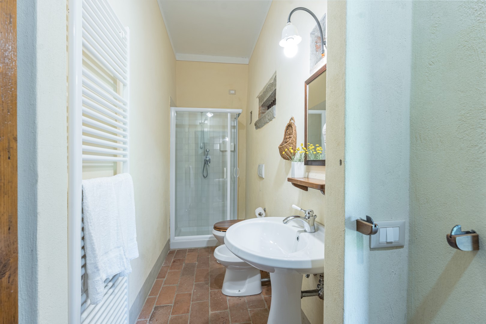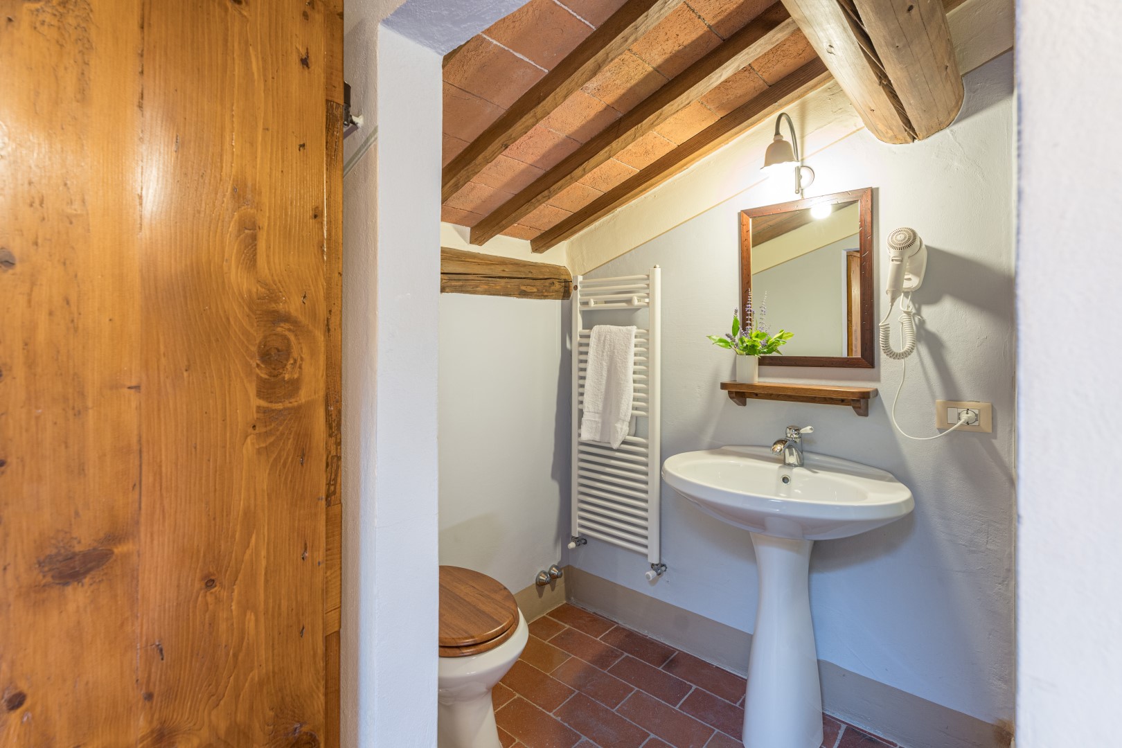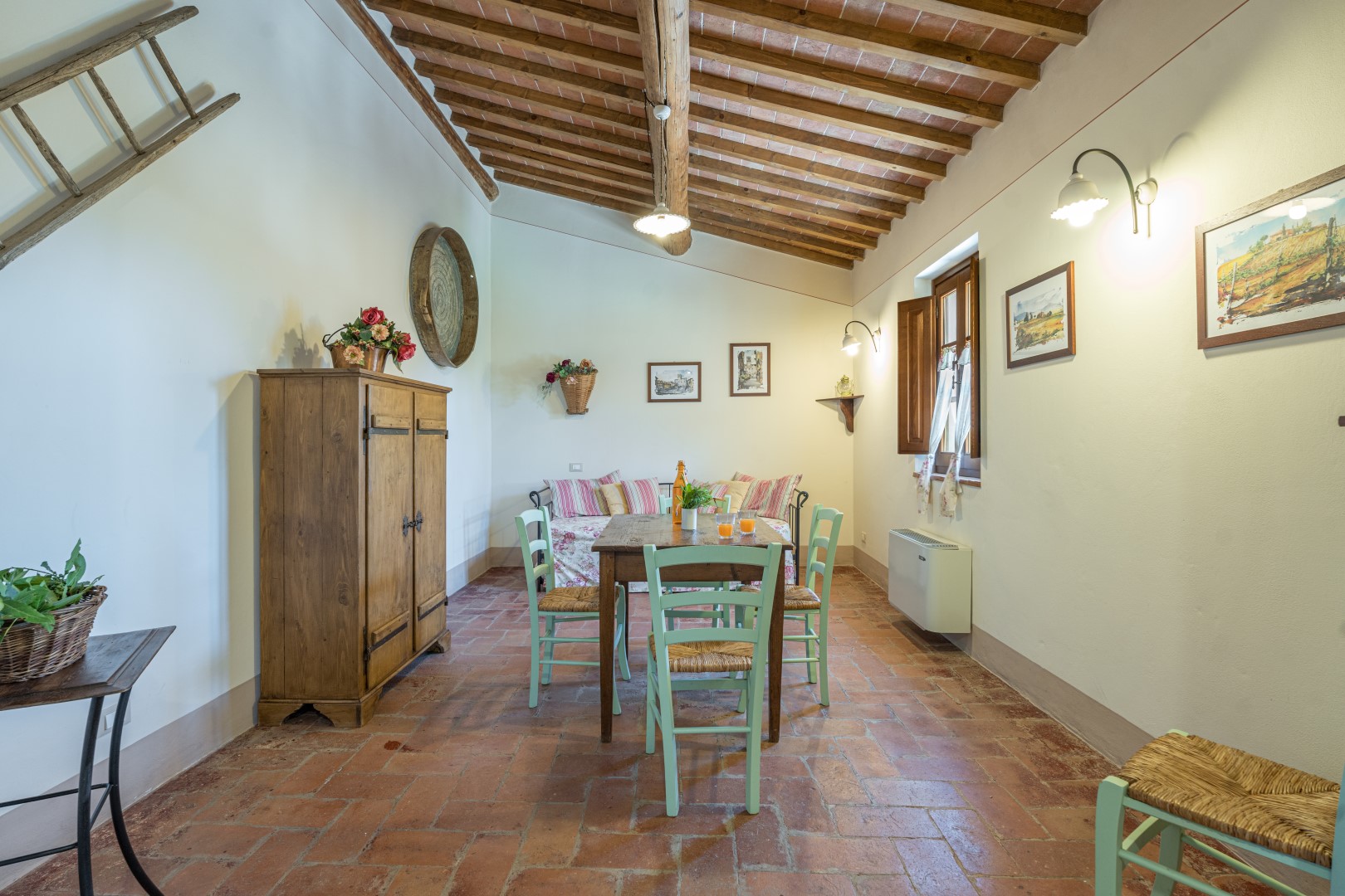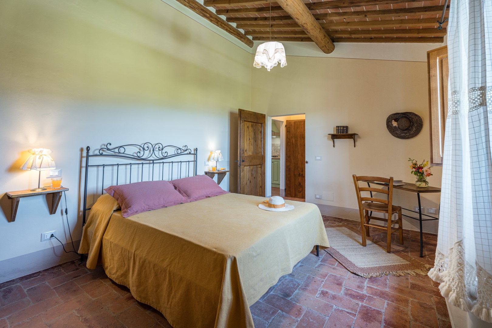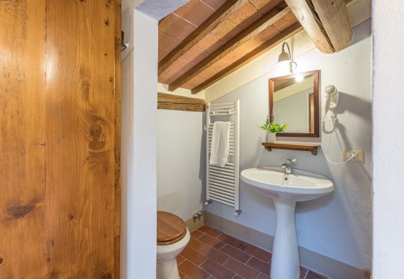 La proprietà si dispone su due piani e comprende il casale principale con le zone comuni e cinque annessi, due al piano terra e tre al primo piano. La struttura centrale cui si accede dall’ingresso principale ospita un ampio soggiorno, la sala da pranzo con caminetto e la cucina attrezzata, collegate tra loro da volte. Completa l’ambiente, un bagno di servizio. All'esterno del piano terra, partono due rampe di scale poste, rispettivamente, alla sinistra e alla destra dell’ingresso principale che conducono ai primi due annessi al primo piano. ANNESSO 1. Si compone di due appartamenti comunicanti tra loro. Uno è composto da una camera matrimoniale e una camera doppia (con letti unibili), entrambe con bagno en-suite con doccia. L'altro appartamento è composto da una camera matrimoniale con un letto singolo e bagno en-suite con doccia. ANNESSO 2. Si trova sullo stesso livello, di fronte all’ingresso del primo annesso, ed è composto da una camera doppia (con letti unibili) e da una camera matrimoniale, ambedue con bagno-en suite con doccia. Una scala a chiocciola conduce alla zona soppalcata con letto singolo (su richiesta è a disposizione il secondo letto estraibile) e un bagno con doccia. ANNESSO 3. Sempre sulla facciata anteriore della villa l’altra scala conduce al terzo annesso, nel quale si trovano uno studio con letto singolo e secondo letto estraibile, una camera matrimoniale e un bagno con doccia. Dal retro della villa si accede, infine, agli ultimi due annessi, posti rispettivamente uno a sinistra e uno a destra del corpo principale. ANNESSO 4. Si compone di una camera matrimoniale e di una camera doppia (con letti unibili cui è possibile accedere anche direttamente dall’esterno), entrambe con bagno-en suite con doccia. ANNESSO 5. Nell’ultimo annesso, infine, è collocata una camera matrimoniale e un bagno con doccia. Ogni annesso è provvisto di un piccolo soggiorno e di angolo cottura. La stanza della lavanderia si trova in un annesso adiacente al casale.