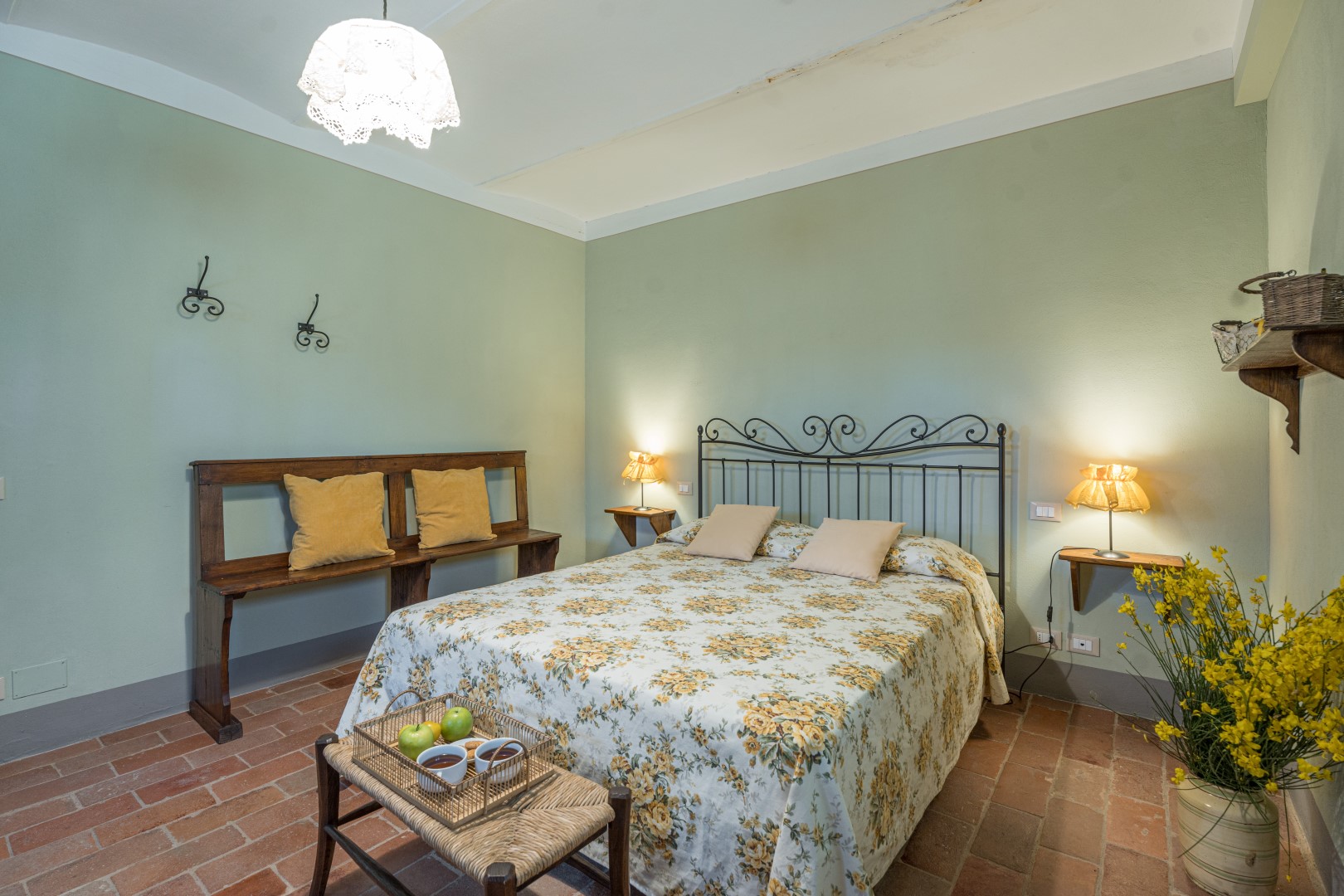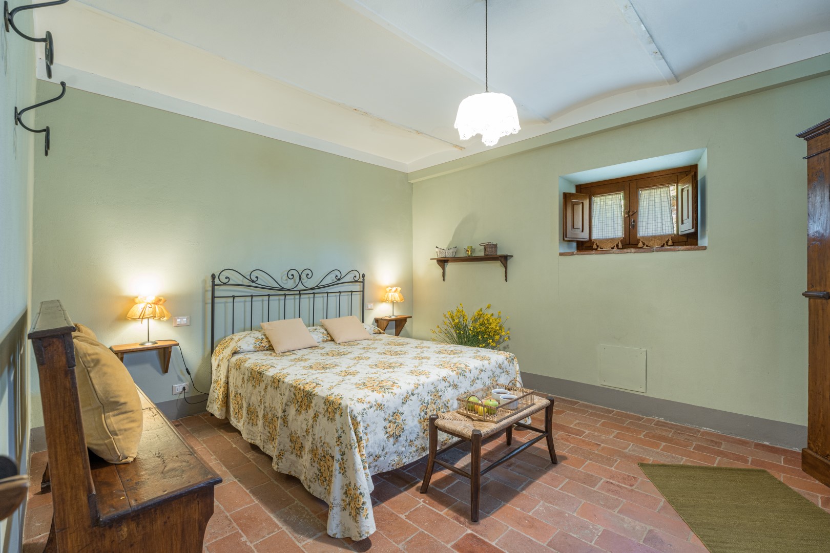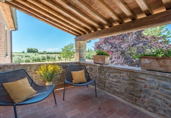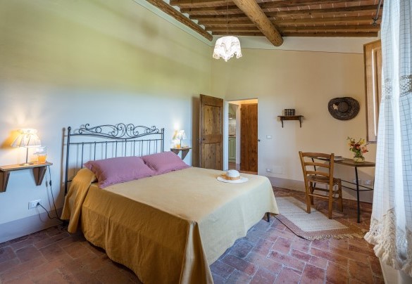 Il parco intorno al casale si estende per un totale di 18 ettari. Aiuole con fiori colorati e piante di lavanda adornano ovunque il giardino con il prato ben curato di circa 2500 mq. A lato della piscina un roseto di rose gialle fa da cornice all’area solarium. La tenuta è ornata dai tipici alberi della vegetazione toscana come gli olivi e gli olmi, nonché da un vasto frutteto a disposizione degli ospiti, composto da noci, fichi, melograni. Gli ampi e ben curati spazi tutto intorno invitano gli ospiti a trascorrere le giornate all’aperto, consumando i loro pranzi e cene in compagnia sotto il grande gazebo all’esterno della cucina, dove a pochi passi si trova il barbecue in pietra, oppure giocando a ping-pong sotto l’ombra di un gazebo o dando qualche calcio al pallone. In alternativa, si potrà decidere di rilassarsi sotto uno dei gazebo collocati in vari punti del giardino, semplicemente ammirando la meravigliosa vista della collina di Cortona che da lì si offre.