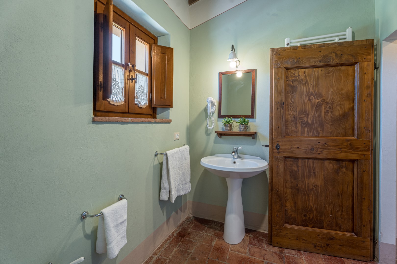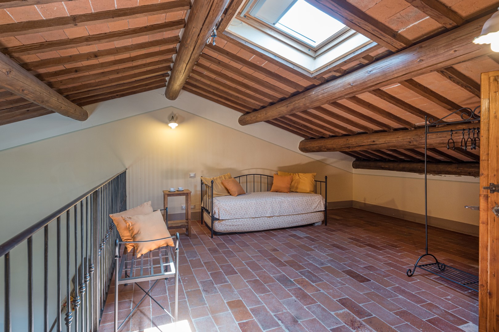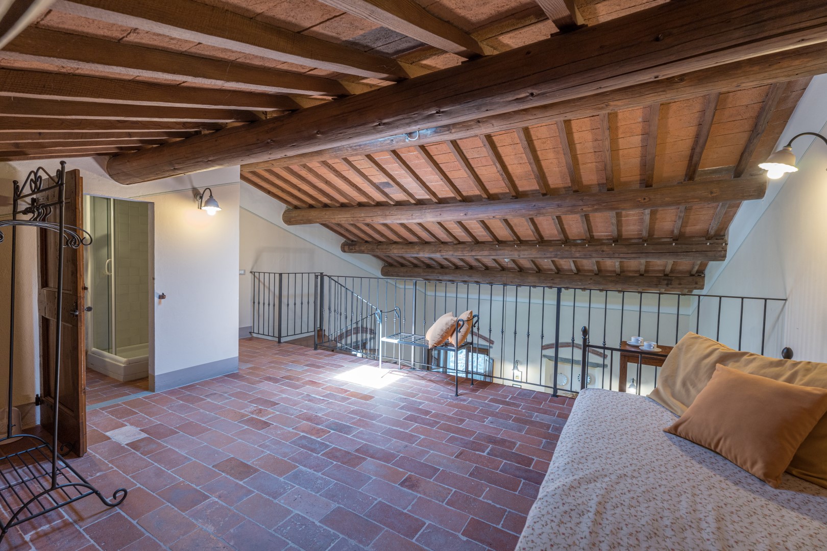 Il parco intorno al casale si estende per un totale di 18 ettari. Aiuole con fiori colorati e piante di lavanda adornano ovunque il giardino con il prato ben curato di circa 2500 mq. A lato della piscina un roseto di rose gialle fa da cornice all’area solarium. La tenuta è ornata dai tipici alberi della vegetazione toscana come gli olivi e gli olmi, nonché da un vasto frutteto a disposizione degli ospiti, composto da noci, fichi, melograni. Gli ampi e ben curati spazi tutto intorno invitano gli ospiti a trascorrere le giornate all’aperto, consumando i loro pranzi e cene in compagnia sotto il grande gazebo all’esterno della cucina, dove a pochi passi si trova il barbecue in pietra, oppure giocando a ping-pong sotto l’ombra di un gazebo o dando qualche calcio al pallone. In alternativa, si potrà decidere di rilassarsi sotto uno dei gazebo collocati in vari punti del giardino, semplicemente ammirando la meravigliosa vista della collina di Cortona che da lì si offre.