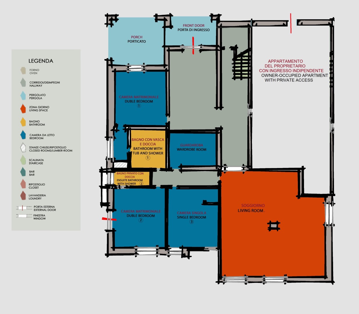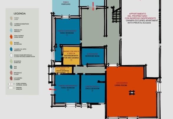 La villa si sviluppa su tre livelli. PIANO SEMINTERRATO – Ingresso tramite portico arredato; camera matrimoniale con bagno adiacente con vasca e doccia; camera matrimoniale con camino ornamentale, accesso al giardino e bagno en suite con doccia; camera singola; ripostiglio; ampio studio-biblioteca; disimpegno con scala di collegamento al piano terra. PIANO TERRA – Ampia veranda con zona soggiorno e pranzo, pianoforte a coda, zona studio e portafinestra sul giardino; soggiorno con camino ornamentale, zona pranzo e angolo TV; salotto con accesso alla veranda; cucina strutturata in due ambienti e scala esterna per accedere alla lavanderia; camera matrimoniale con bagno en suite con doccia; camera singola; bagno con vasca. PIANO MANSARDATO – Due camere matrimoniali con bagno en suite: una con camino ornamentale e bagno con doccia e vasca in ambienti separati; l’altra con bagno en suite con doccia.
