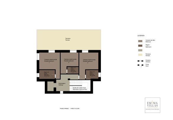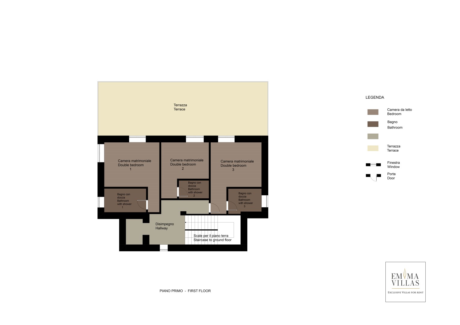PRIMO PIANO – Tre camere matrimoniali, ciascuna con bagno en-suite con doccia.