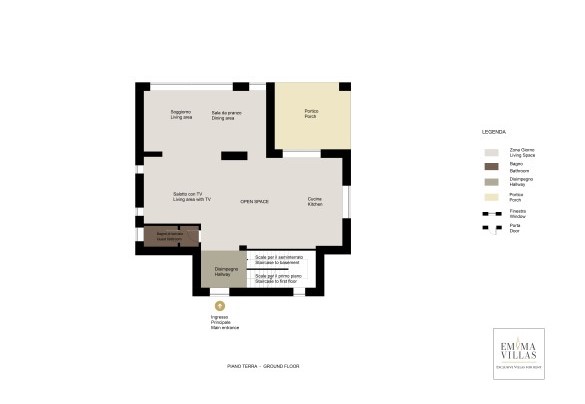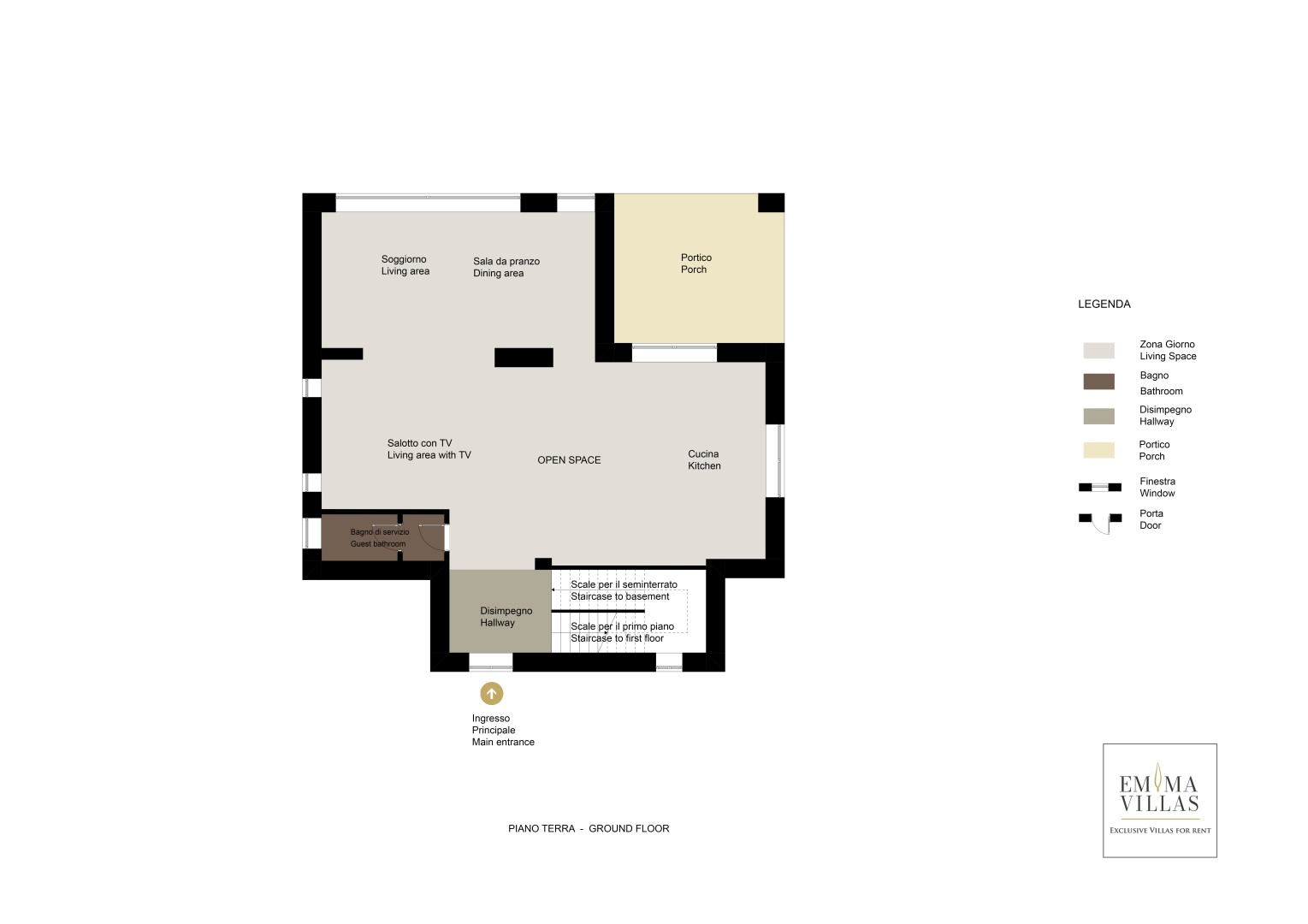PIANO TERRA – Ampia zona giorno open space con salotto, camino ornamentale, smart TV, tavolo da pranzo e cucina completamente attrezzata; bagno di cortesia; accesso diretto al giardino e alla piscina tramite grandi porte-finestre scorrevoli.