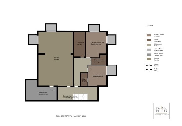 PIANO SEMINTERRATO – Camera matrimoniale con finestra a bocca di lupo, dotata di bagno privato con doccia; locale lavanderia.