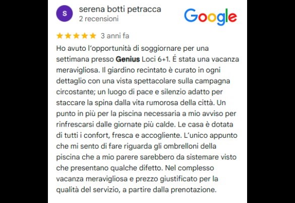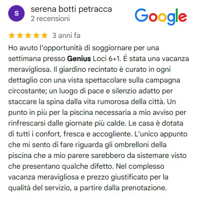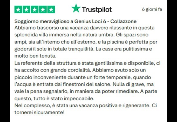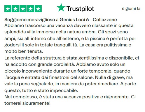 STRUTTURA PRIVATA (solo locazione) Dimora di recente costruzione arredata con materiali di grande prestigio, Genius Loci fonde insieme le tradizioni e le maestrie umbre con quelle della Costiera Amalfitana, luogo di nascita dei proprietari, seguendo un unico filo conduttore che è appunto il Genius Loci, ovvero lo “Spirito del Luogo”, la divinità che secondo gli antichi romani era legata ad un determinato luogo fino ad esserne l'anima e che in questo caso è stata scelta come simbolo di buon auspicio. Una lastra in pietra scolpita a mano accanto l'ingresso raffigura questa entità e ad illustrarci il percorso all'interno di queste culture differenti, vera essenza della casa, sono proprio i pannelli di ceramica Vietrese dipinti a mano che decorano vari angoli dell'area living, le lampade in terracotta di fattura fiorentina, la pietra rosa e bianca di San Terenziano usata nei rivestimenti del camino con fregi raffiguranti scene etrusche e nei ripiani della cucina, e ancora il bellissimo tavolo fratino del '600 nella sala da pranzo, i mobili d'antiquariato dell'800, i letti in ferro battuto da artigiani locali e il bancone bar del salotto ricavato da vecchi travi in legno. Un vero gioiello dunque, esaltato maggiormente da un giardino ben curato e dalla piscina privata che fa della privilegiata posizione panoramica il suo punto di forza. Percorrendo le paesaggistiche strade che si snodano attraverso l'Umbria si arriva in breve tempo a vere meraviglie di una terra abitata sin da tempi remoti come Perugia, Todi, Assisi, Orvieto, Spello e Foligno. Invece con spostamenti più consistenti ma comunque agevoli se si sfruttano l'Autostrada del Sole e la E 45, si raggiungono Cortona, Montepulciano e altre località turistiche della Toscana del Sud.