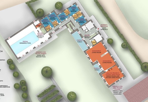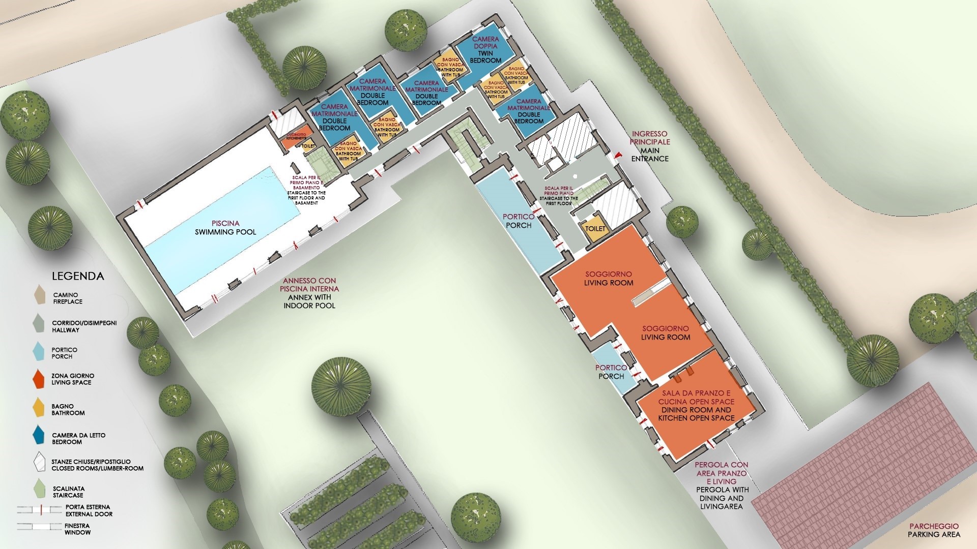 La proprietà è costituita dal corpo principale della struttura e da un annesso. CORPO PRINCIPALE: è disposto su due livelli comunicanti. Dall’entrata principale, situata a piano terra, si entra direttamente all’ampio salone con più zone living, con confortevoli e soffici divani e un particolare camino ornamentale al centro. Dal salone si passa poi all’openspace della cucina e alla sala da pranzo con accesso diretto all’ ampio porticato attrezzato con area pranzo e zona relax con divani e tavolini. A destra dell’ingresso principale, troviamo una zona notte con quattro camere matrimoniali (una con letti divisibili), una camera doppia, tutte con bagno en-suite con vasca. Completa il piano un bagno ospiti. Dall’entrata, una rampa di scale in muratura conduce al primo piano, composto da: una camera matrimoniale e una camera doppia (con letti a castello), che possono essere collegate fra di loro formando una unica suite (ideale per una famiglia), un bagno adiacente con doppia doccia e un bagno di servizio. Dalla camera matrimoniale si accede inoltre alla terrazza e all’area della piscina. La terrazza, che si affaccia con una vista mozzafiato sulla campagna circostante, sul vigneto e sulla splendida città di Assisi, ospita una nuovissima mini piscina idromassaggio per 8 persone con acqua più o meno calda a seconda delle preferenze degli ospiti. Tutta la casa principale è dotata di un sistema di raffrescamento a pavimento. ANNESSO: vi si accede sia dal piano terra (direttamente dal corridoio delle camere da letto) che dalla terrazza al primo piano, ospita la spettacolare piscina. Da qui, tramite una scala interna, si raggiunge il seminterrato composto da un bagno turco, una palestra attrezzata, un bagno, due spogliatoi ed un grande bagno con doppie docce. Nota bene: il pianoforte è ornamentale.