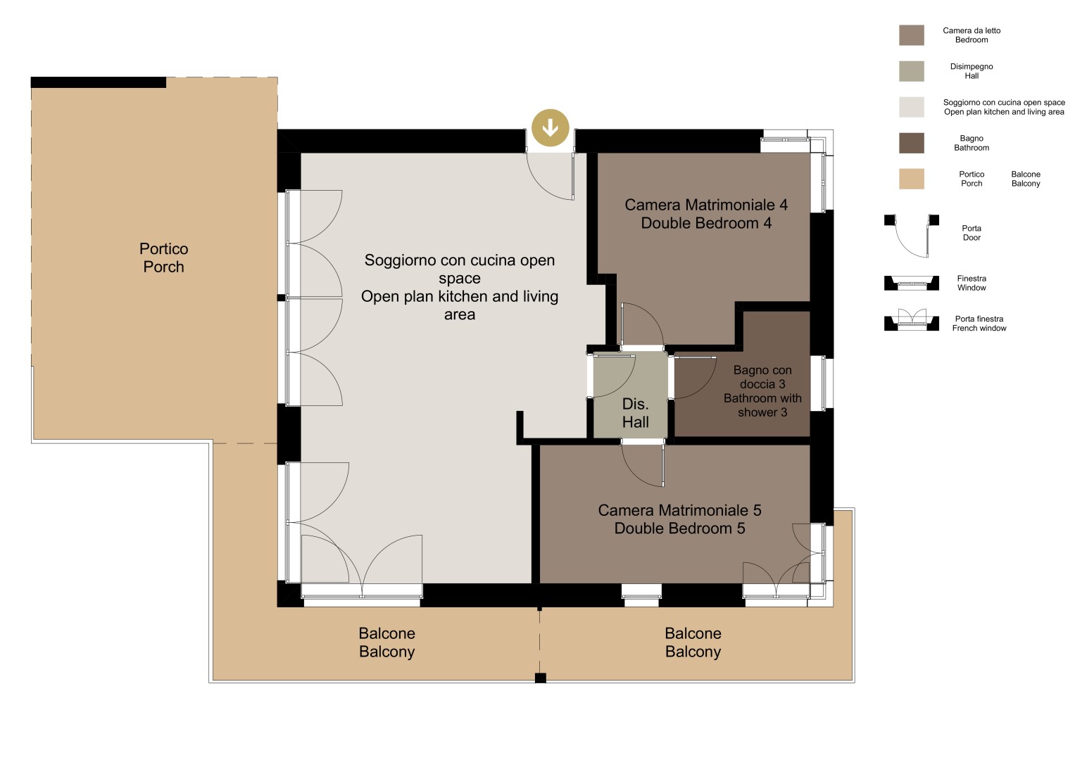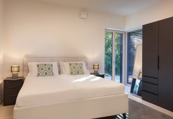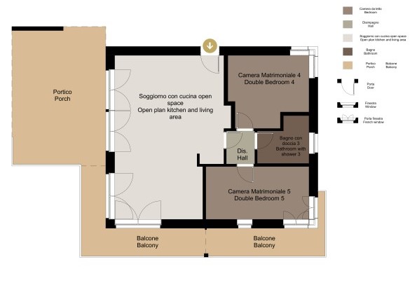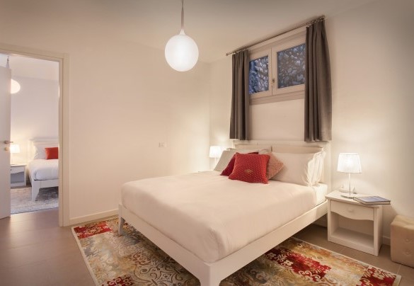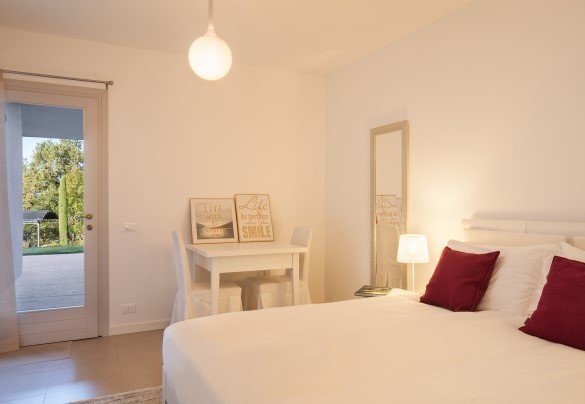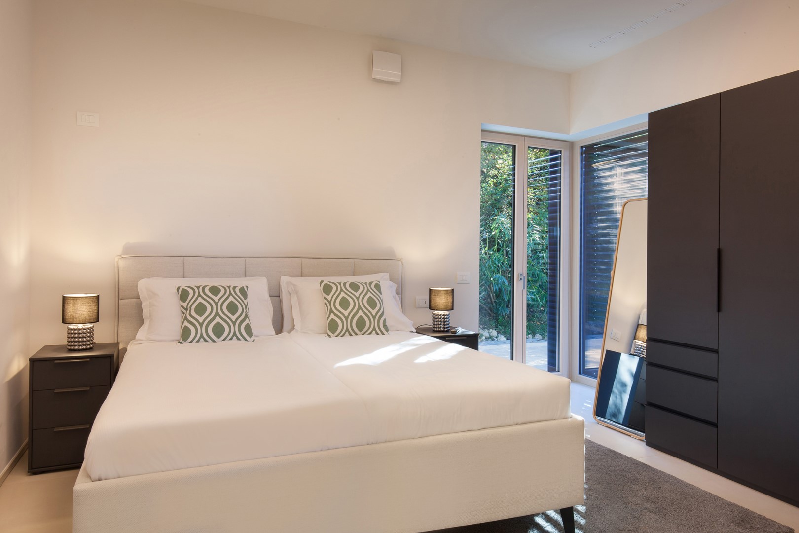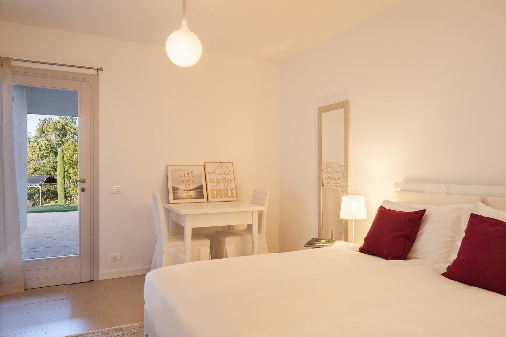La villa è suddivisa in due piani indipendenti, non comunicanti internamente. PIANO TERRA – Ingresso; soggiorno open space con salotto, tv e tavolo da pranzo per sei persone; cucina; bagno con vasca; camera matrimoniale con accesso diretto all’esterno; cabina armadio; una camera matrimoniale comunicante con una seconda camera matrimoniale (dotata di accesso indipendente e servita da un bagno con doccia con accesso dall’esterno. PIANO PRIMO (si raggiunge da scala esterna posta su un lato della villa) - Soggiorno con cucina open space dotato di ampie vetrate che accedono sul portico con area salotto e angolo cottura esterno; due camere matrimoniali; un bagno con doccia walk-in. La lavatrice è integrata nella cucina al primo piano.