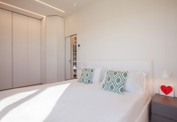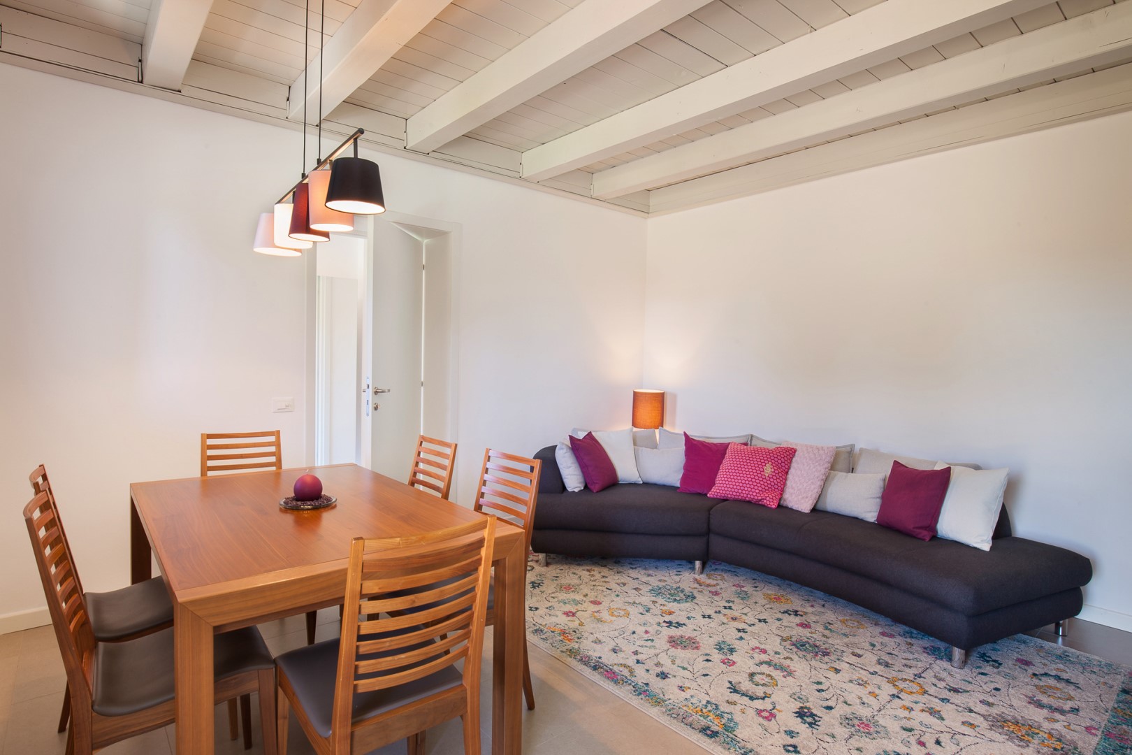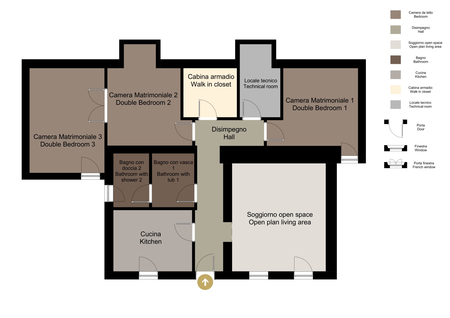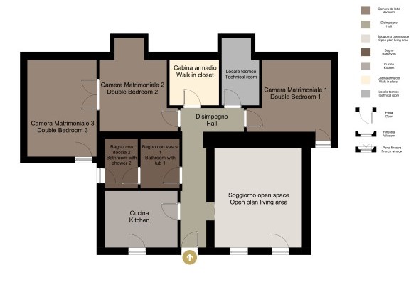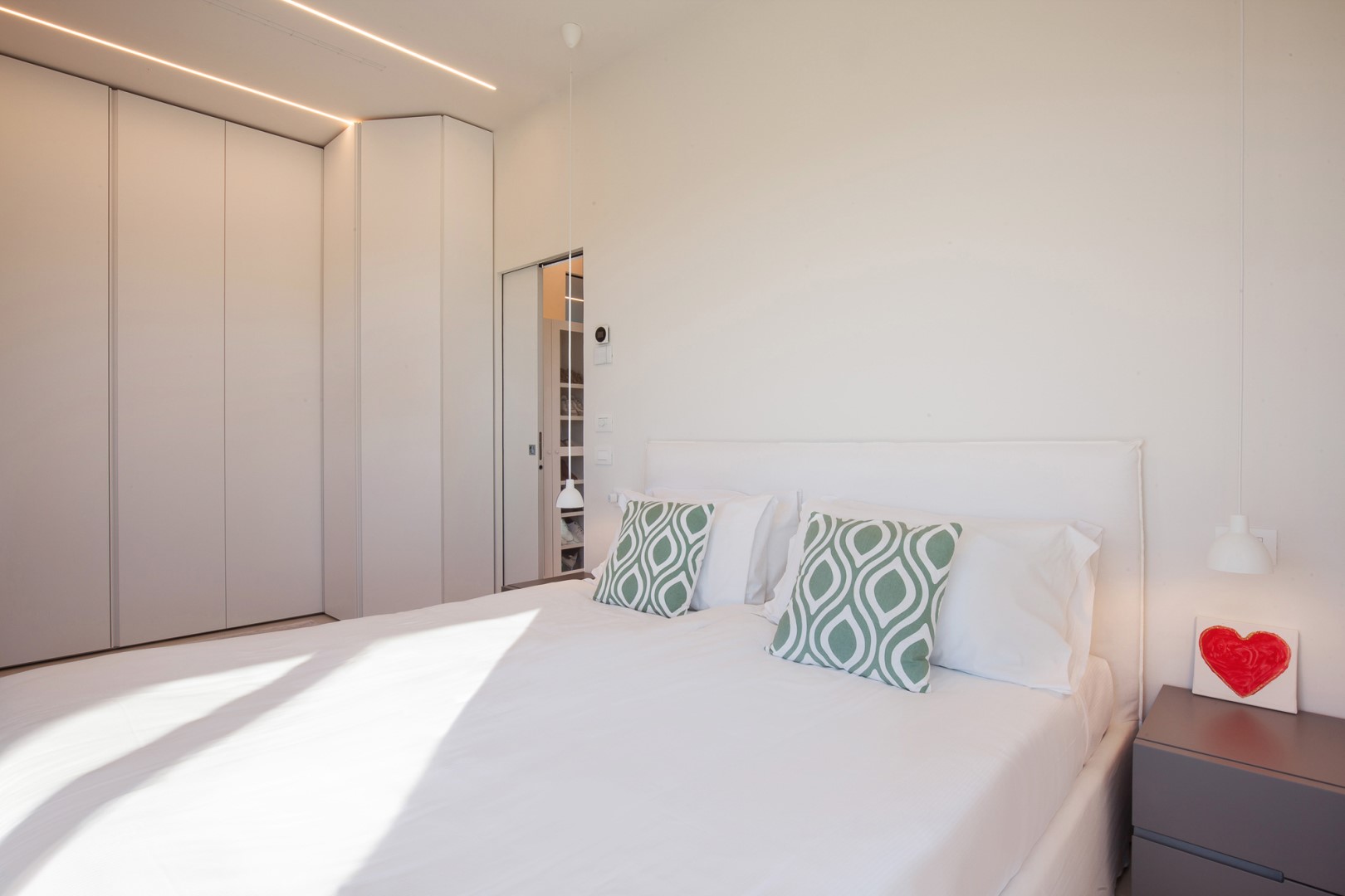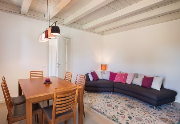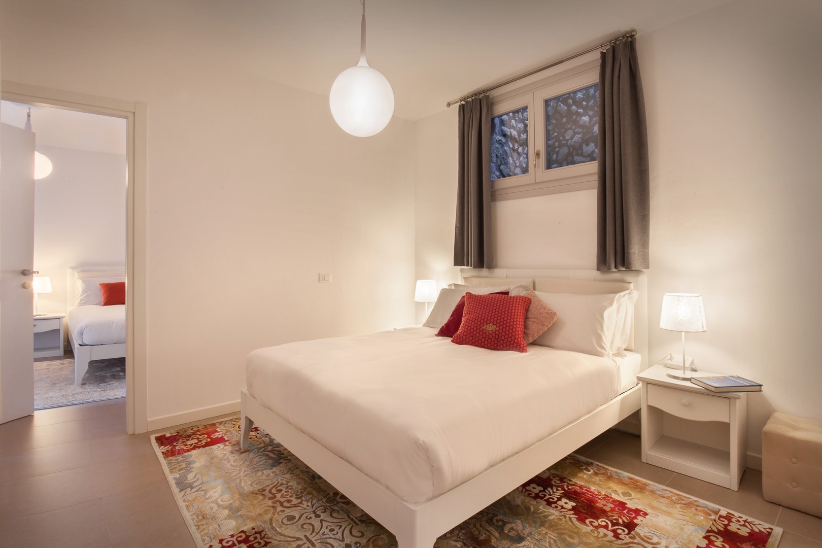 La villa è suddivisa in due piani indipendenti, non comunicanti internamente. PIANO TERRA – Ingresso; soggiorno open space con salotto, tv e tavolo da pranzo per sei persone; cucina; bagno con vasca; camera matrimoniale con accesso diretto all’esterno; cabina armadio; una camera matrimoniale comunicante con una seconda camera matrimoniale (dotata di accesso indipendente e servita da un bagno con doccia con accesso dall’esterno. PIANO PRIMO (si raggiunge da scala esterna posta su un lato della villa) - Soggiorno con cucina open space dotato di ampie vetrate che accedono sul portico con area salotto e angolo cottura esterno; due camere matrimoniali; un bagno con doccia walk-in. La lavatrice è integrata nella cucina al primo piano.