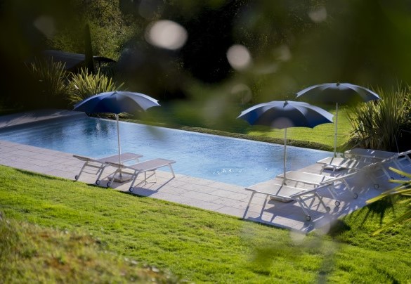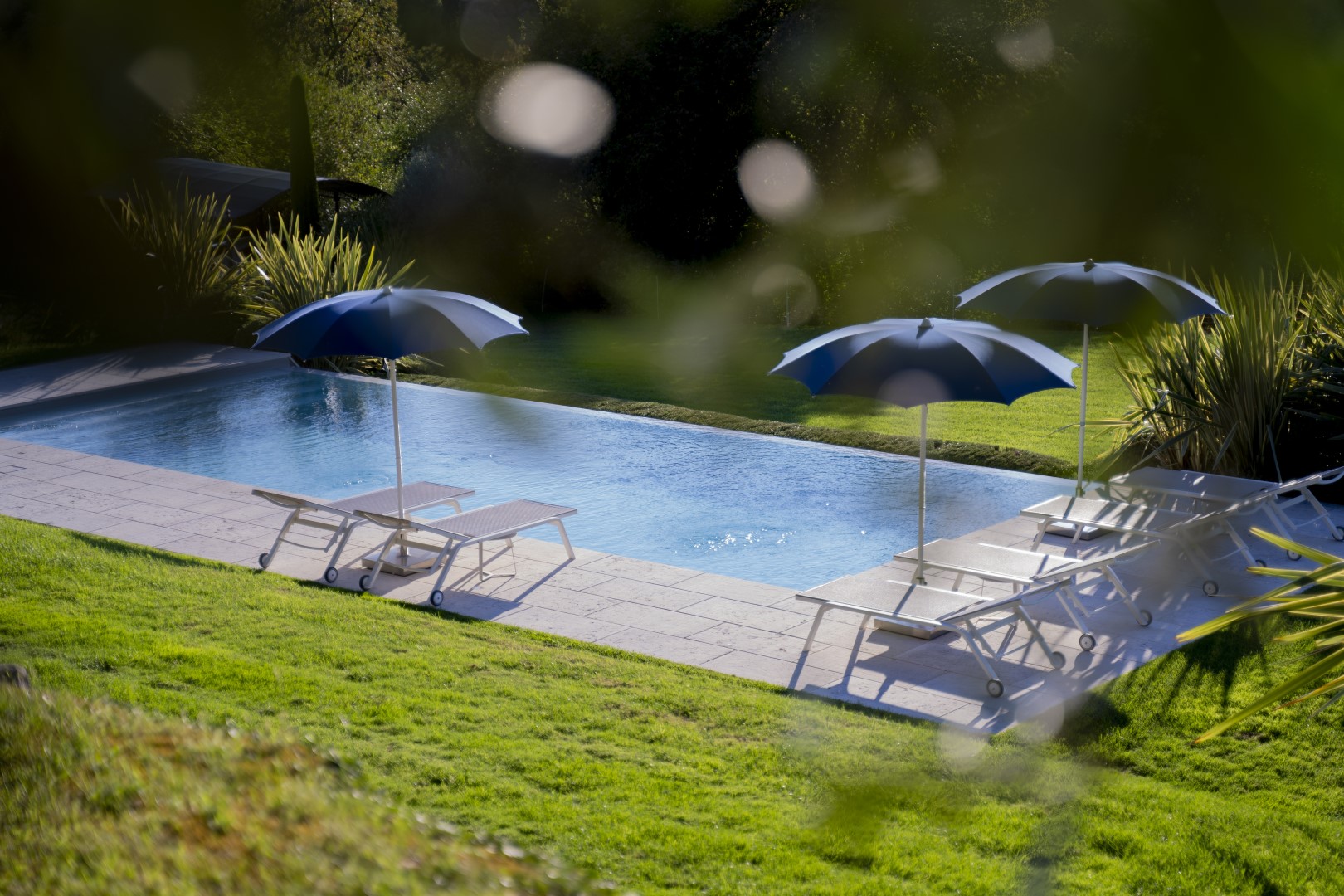 La piscina è collocata su un lato del giardino a pochi passi dagli accessi in villa. Forma rettangolare; dimensioni 12x5 m e profondità tra 1,40 e 2 metri. Rivestimento interno con piastrelle; illuminazione interna; impianto di depurazione a cloro. Area solarium con lettini, ombrelloni e doccia con acqua fredda. Aperta dal 20 maggio al 30 settembre.