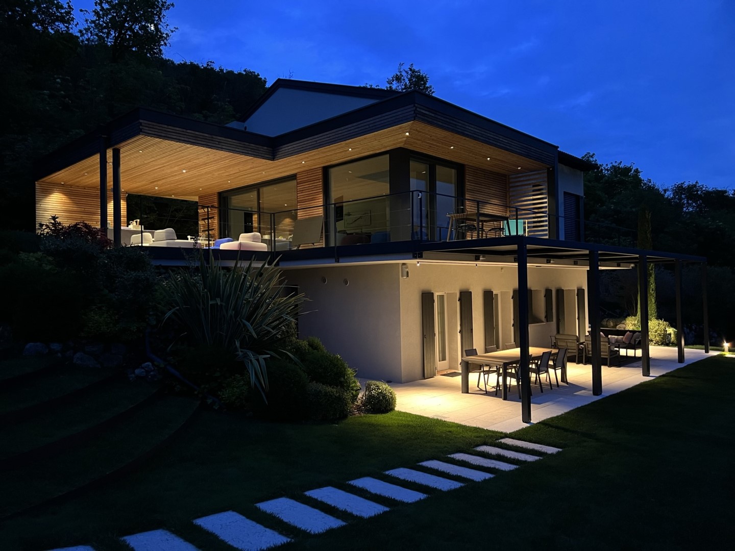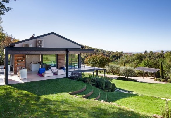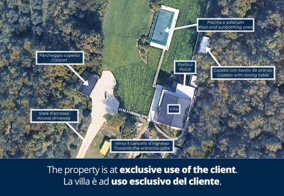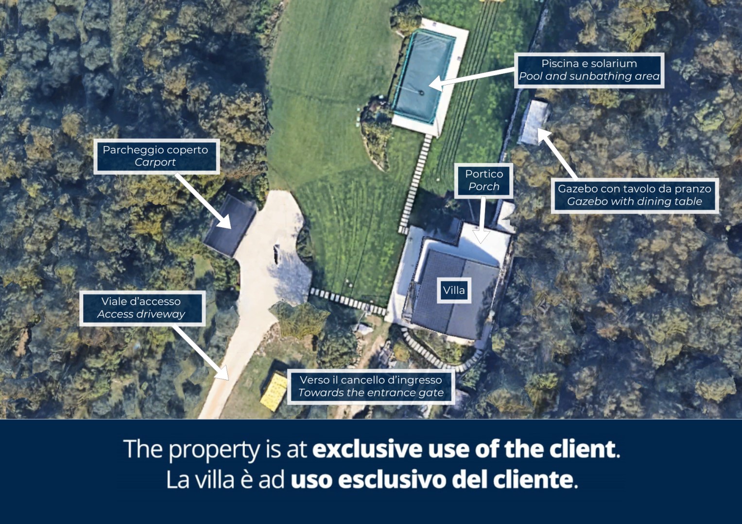 Gli esterni sono ampi, curati e offrono massima privacy. Il grande giardino che circonda la villa ospita alberi da frutto e un uliveto e confina a monte con una tranquilla zona boschiva. I porticati sono arredati per sostare e mangiare all’aperto. Nei pressi della piscina un gazebo ombreggia un ulteriore tavolo da pranzo. Alla fine del viale di accesso un cancello carrabile immette nella proprietà che dispone di un’area parcheggio coperta per tre posti auto.